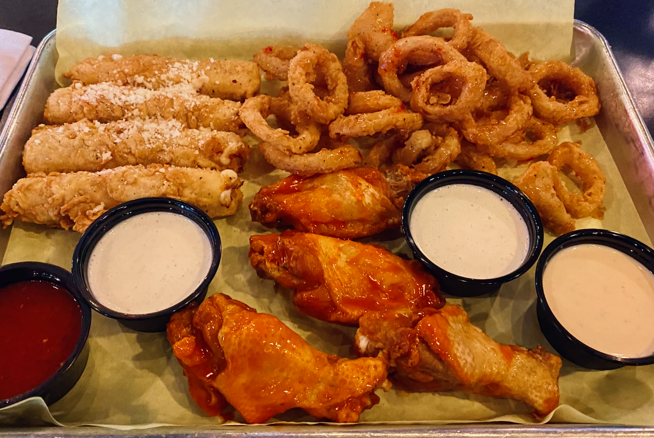 During a recent visit, we opted for the sampler platter, $15 for three items. We went with the Thai calamari, a twist on the classic fried appetizer with the added tang of a spicy chili sauce. The cheese sticks aren’t your typical from-the-freezer-to-the-fryer variety. The hand-battered panko-like crust had a nice crunch over the gooey mozzarella. You can order wings fried, grilled or breaded, with eight sauce options.