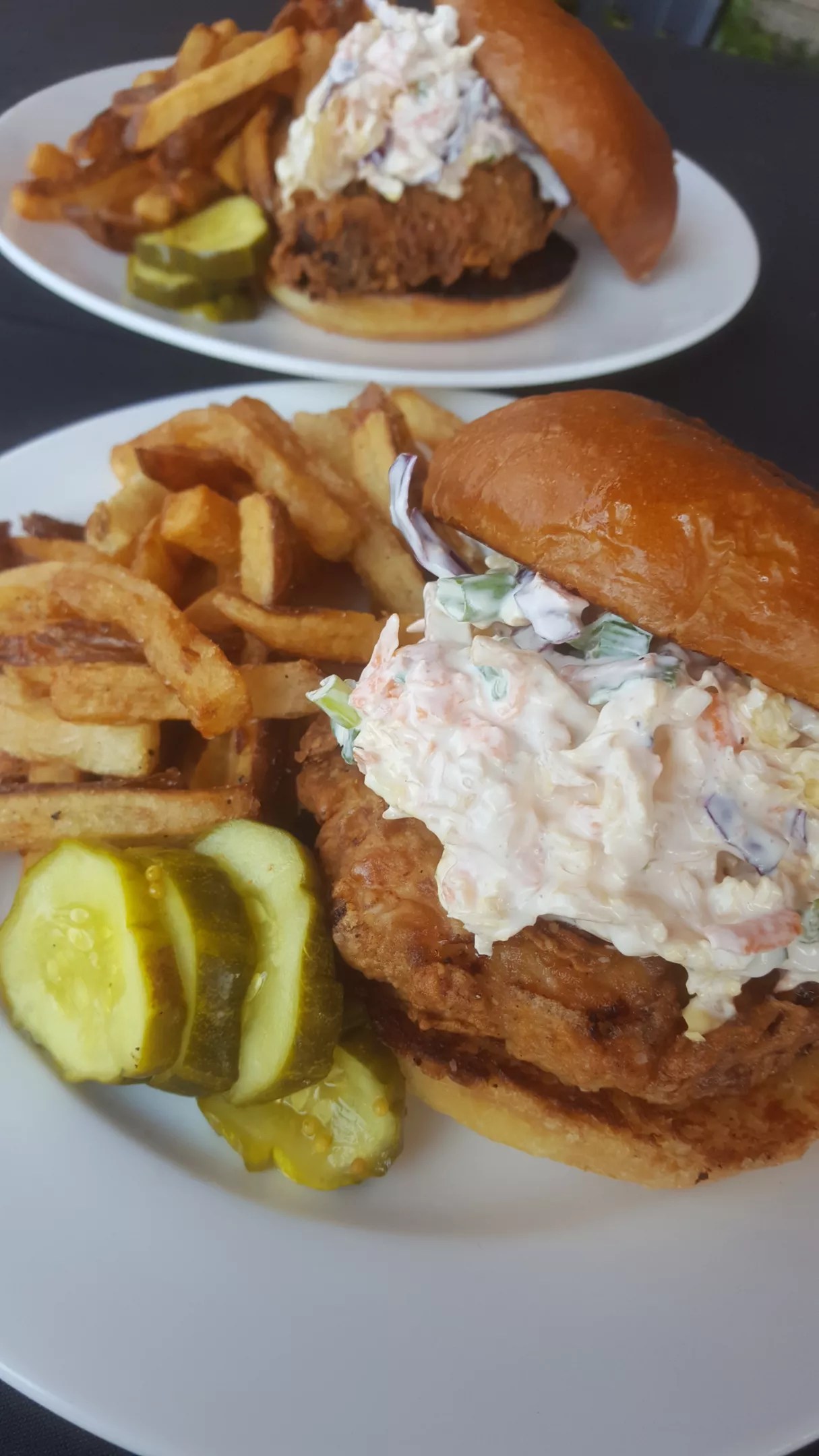 On the bun they go, followed by only a scoop of slaw, invigorating the crunchy, fried, buttery chicken. Pickles are on the side.