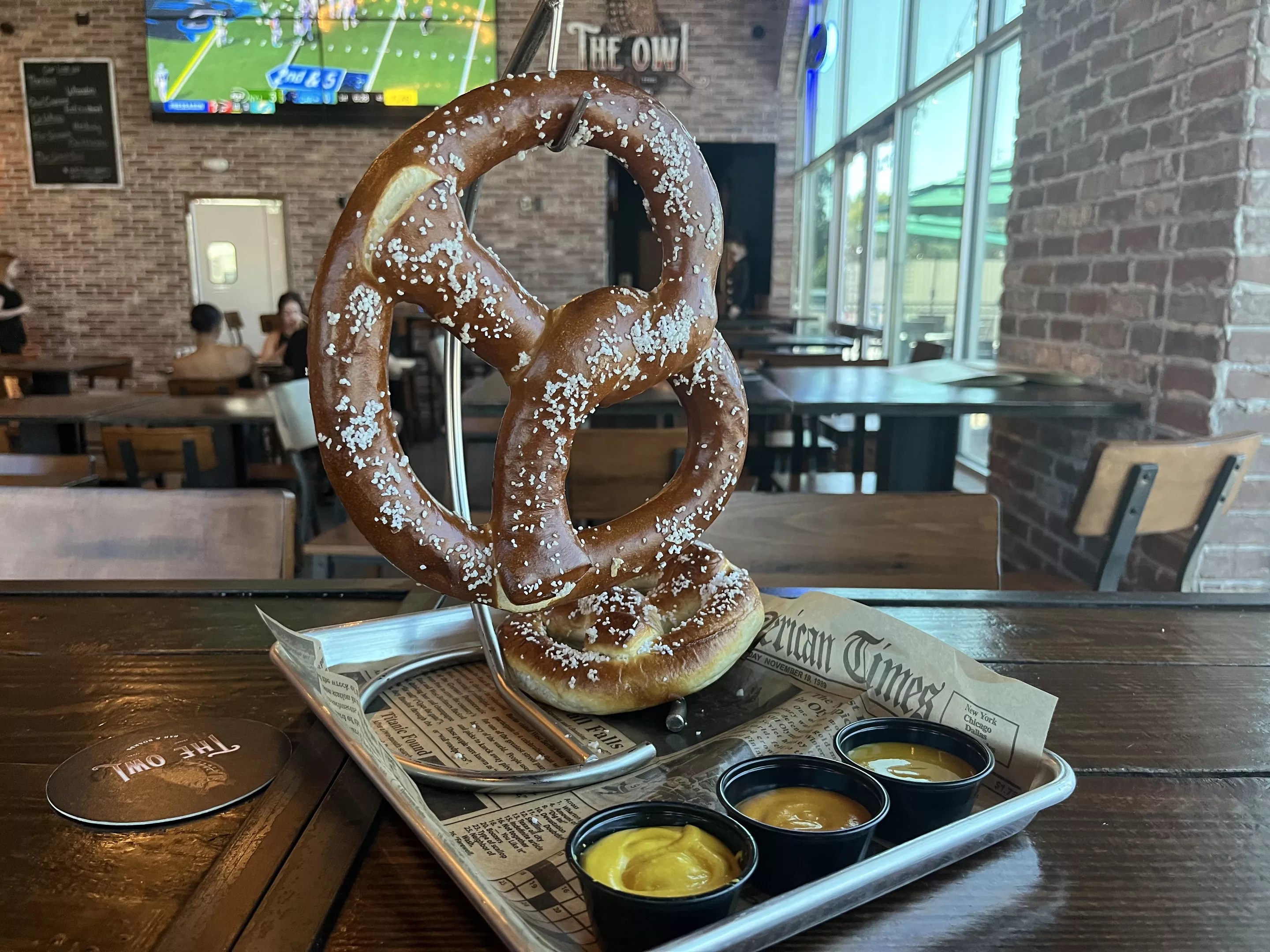 Pizzas are thin-crusted enough to be considered light, but big enough to satiate the appetite. Drinks lead well into the screech pizza – decorated in pepperoni and a hot sauce drizzle – or perhaps an Owl Pacino, dressed in fig jam, prosciutto and goat cheese. Priced between $17 and $20, the pizzas are complemented by giant boards of artisan pretzels and dips. Munch on the Bavarian pretzel that’s about the size of a human head, served hanging over an array of three mustards.