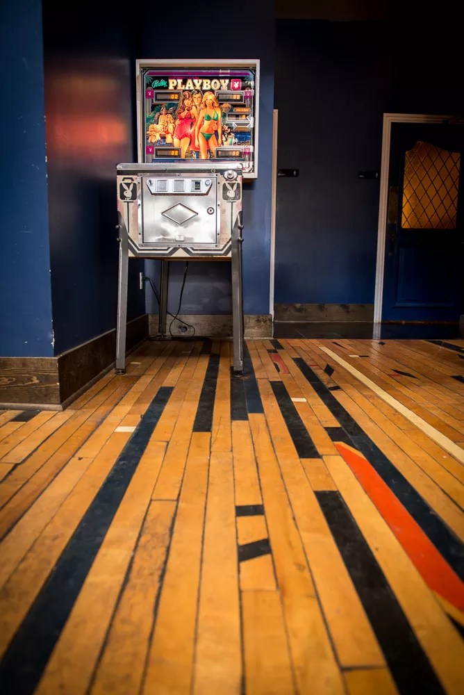 The floors are made from old gymnasium flooring, and the pinball machine is of the vintage Playboy variety.
