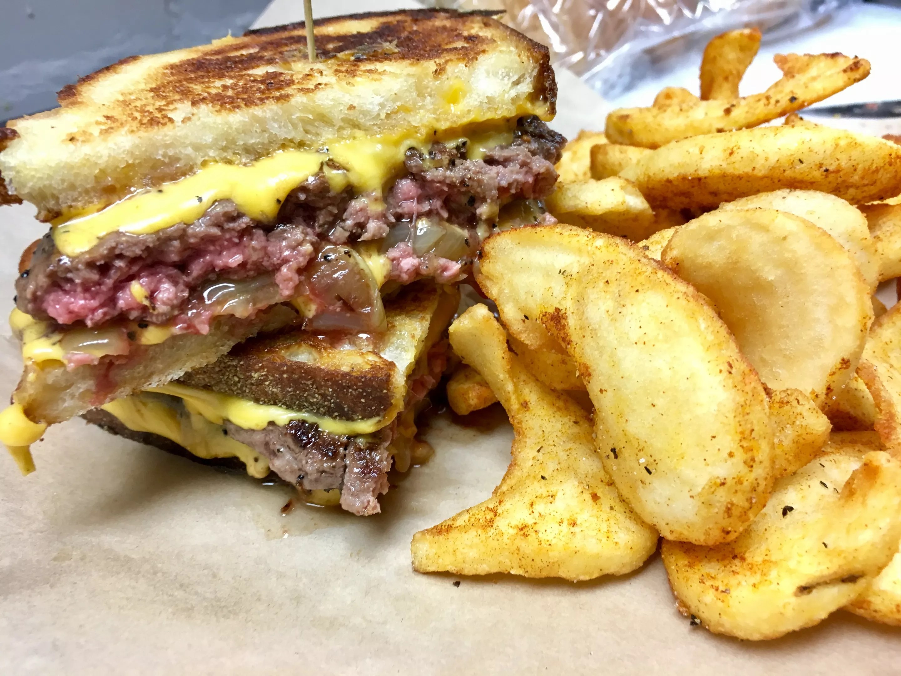 Take one look at the cross section, and you can see the specks of black pepper. Everything’s given the attention of good seasoning. The American cheese fuses into the toasted bread, like a grilled-cheese sandwich, while the beef (80 percent beef, 20 percent fat) is salted, peppered and seared on the smoking-hot side of the griddle.