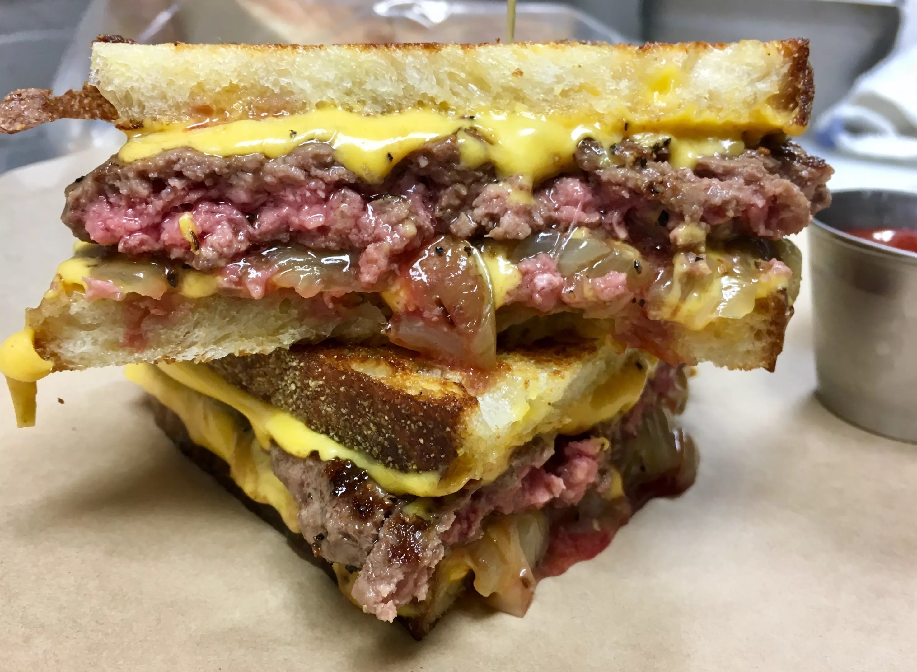 Take one look at the cross section, and you can see the specks of black pepper. Everything’s given the attention of good seasoning. The American cheese fuses into the toasted bread, like a grilled-cheese sandwich, while the beef (80 percent beef, 20 percent fat) is salted, peppered and seared on the smoking-hot side of the griddle.