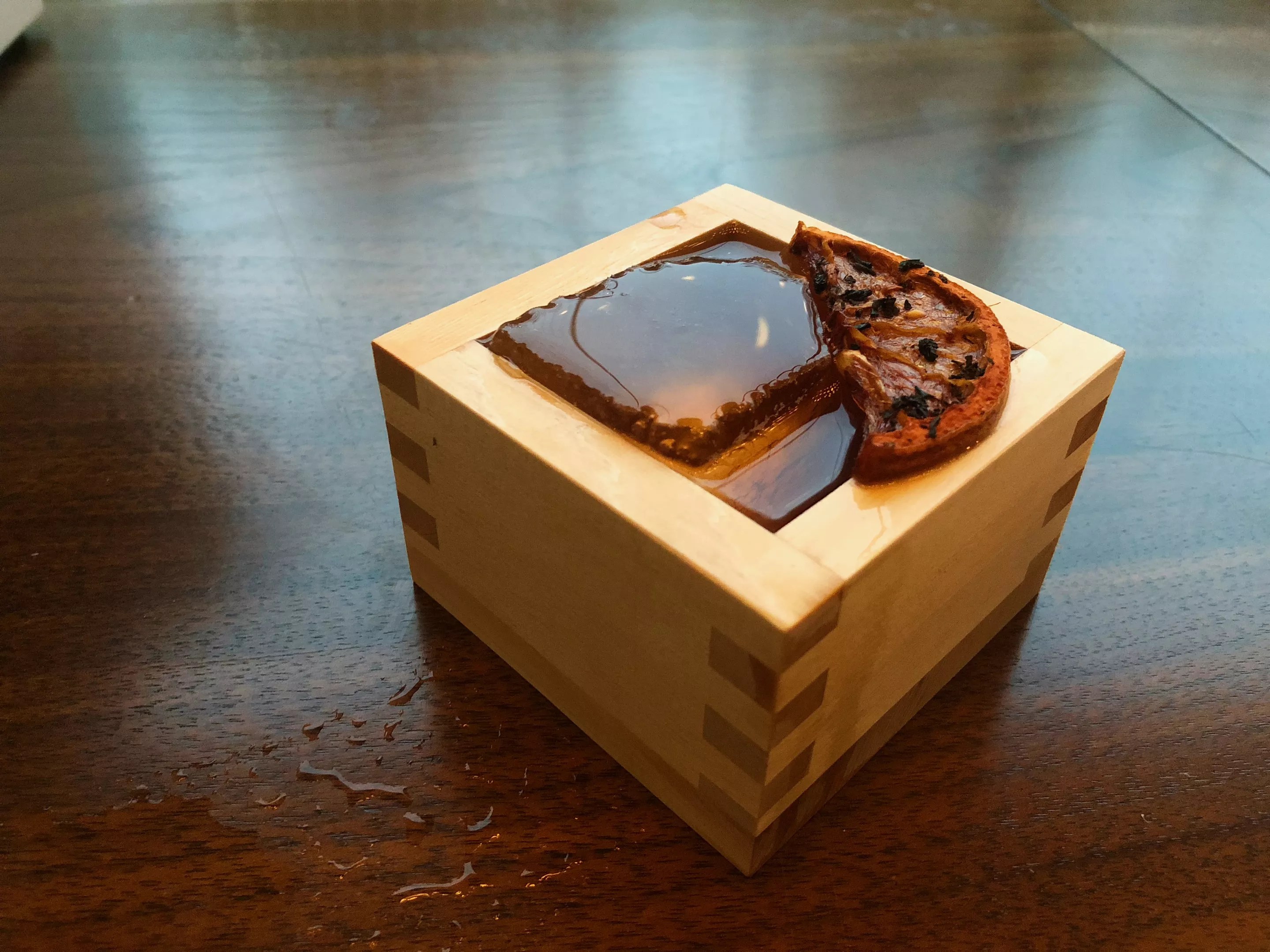 To start, you may order the tiger’s eye ($12) with bourbon, Gran Classico, vermouth and bitters. The drink is well made, but someone went a touch past creative and decided to put it in a small wooden box, despite the fact that this isn’t sake, and a large ice cube dominates the square opening.