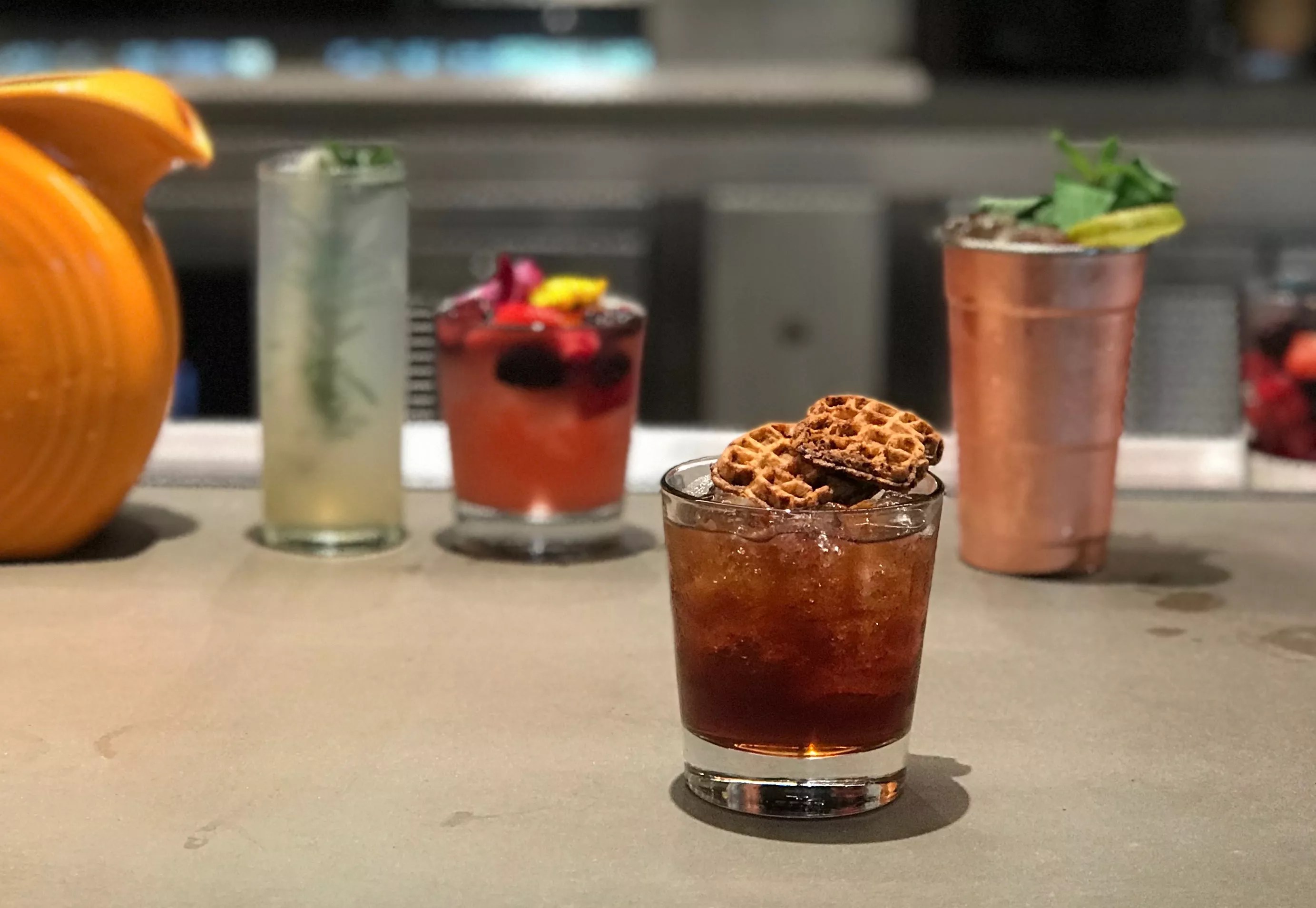 The Merit Badge () is made with pecan-infused Wild Turkey 81, maple, angostura bitters and burnt waffles.