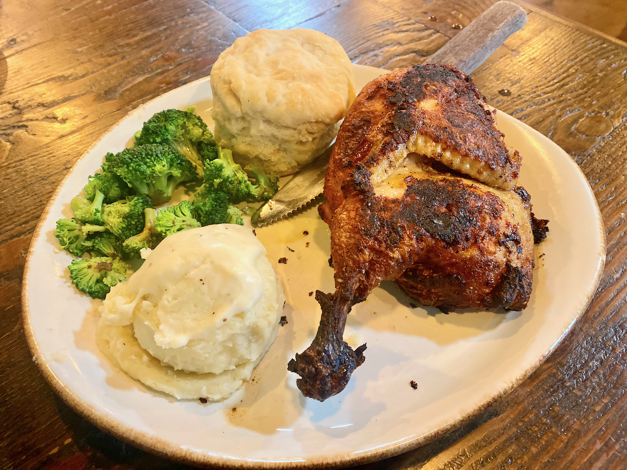 Our second entrée was the Slow Burn Chicken ($20), a half “slow-smoked” chicken with an almost blackened skin and lollipop trimmed leg. This was an amazing half-bird, and for the price, is two meals easy. It’s well seasoned with a kiss of smoke from the extra-crispy skin and meat. The mashed potatoes, broccoli and enormous buttermilk biscuit rounded out this rather comforting meal. (Actually, we wrapped up the biscuit and warmed it up for breakfast the next morning.)