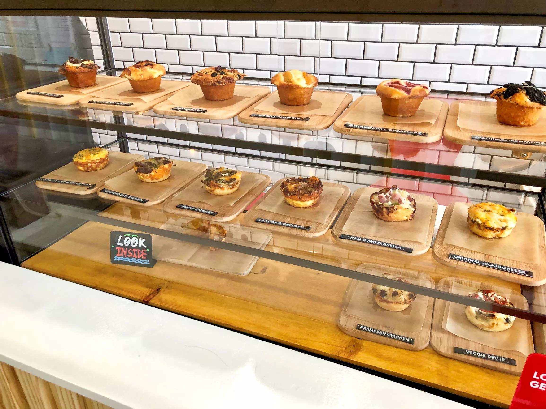 Most of the savory muffins on the menu have a whole egg baked inside, surrounded by muffin breading and topped with cheese and meat or vegetables.