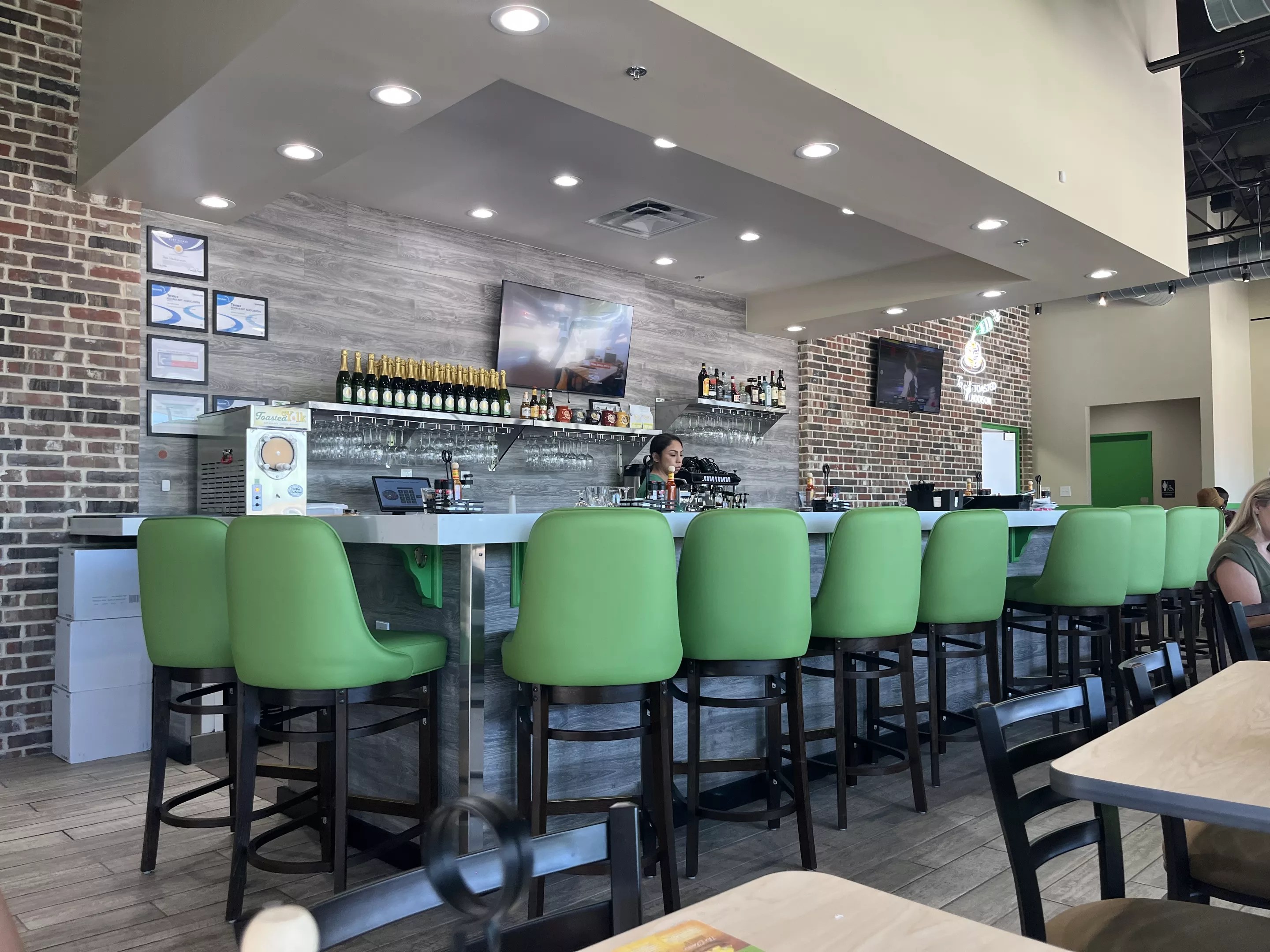 For starters, the brunch selection is huge. A rectangular 1-by-2-foot cardboard placemat details (almost) everything the chain has to offer. Favorites like an apple-cinnamon French toast come alongside seasonal offerings like fried-chicken pancake tacos. Order a plate of The Toasted Yolk’s signature cheesy grits or dive into a plate of gravy-smothered biscuits. An egg-brisket scramble and fried-chicken Benedict both add uniquely Southern twists on brunch classics.