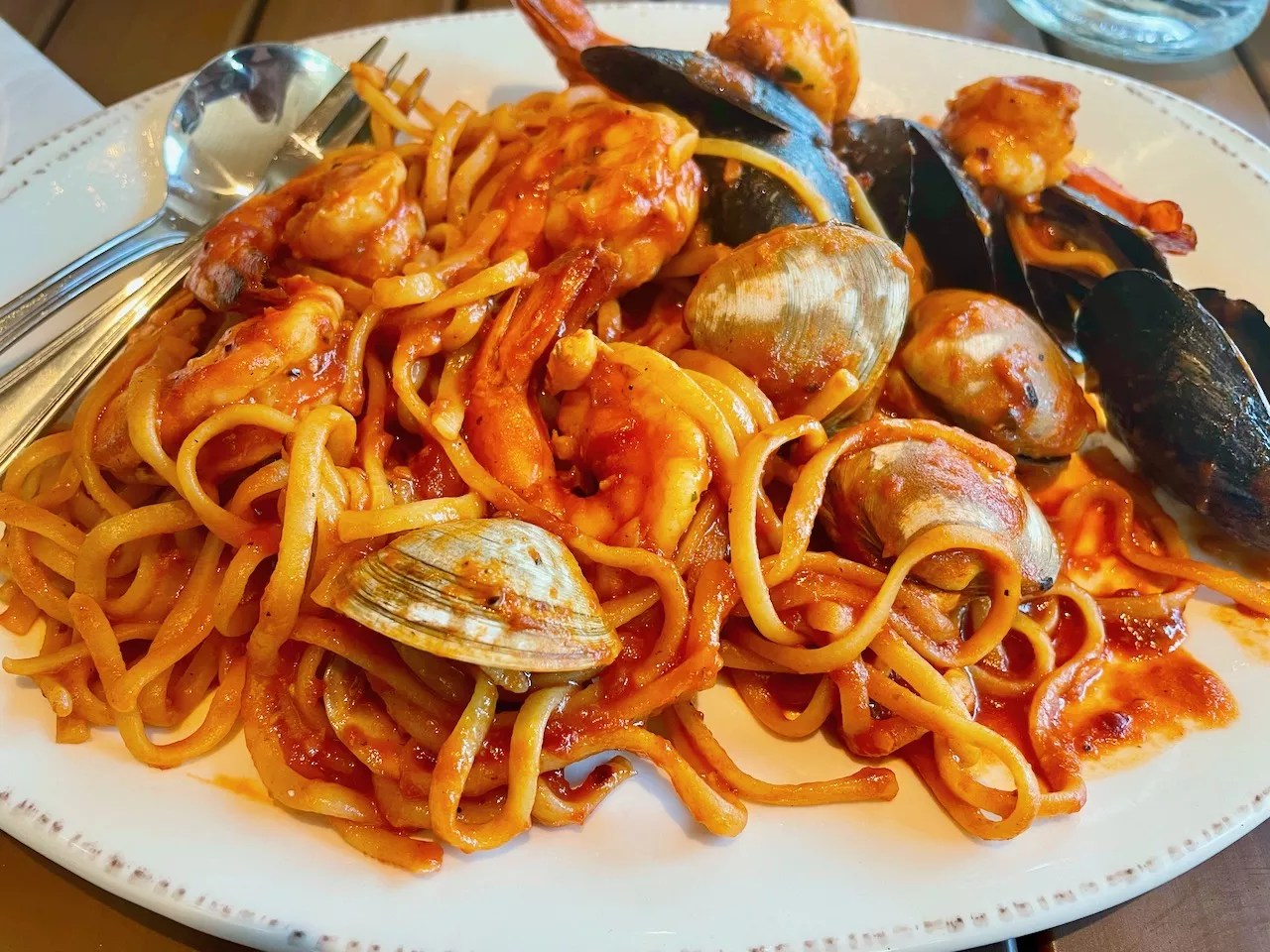The Nantucket Seafood Pasta is served with a spicy marinara sauce.