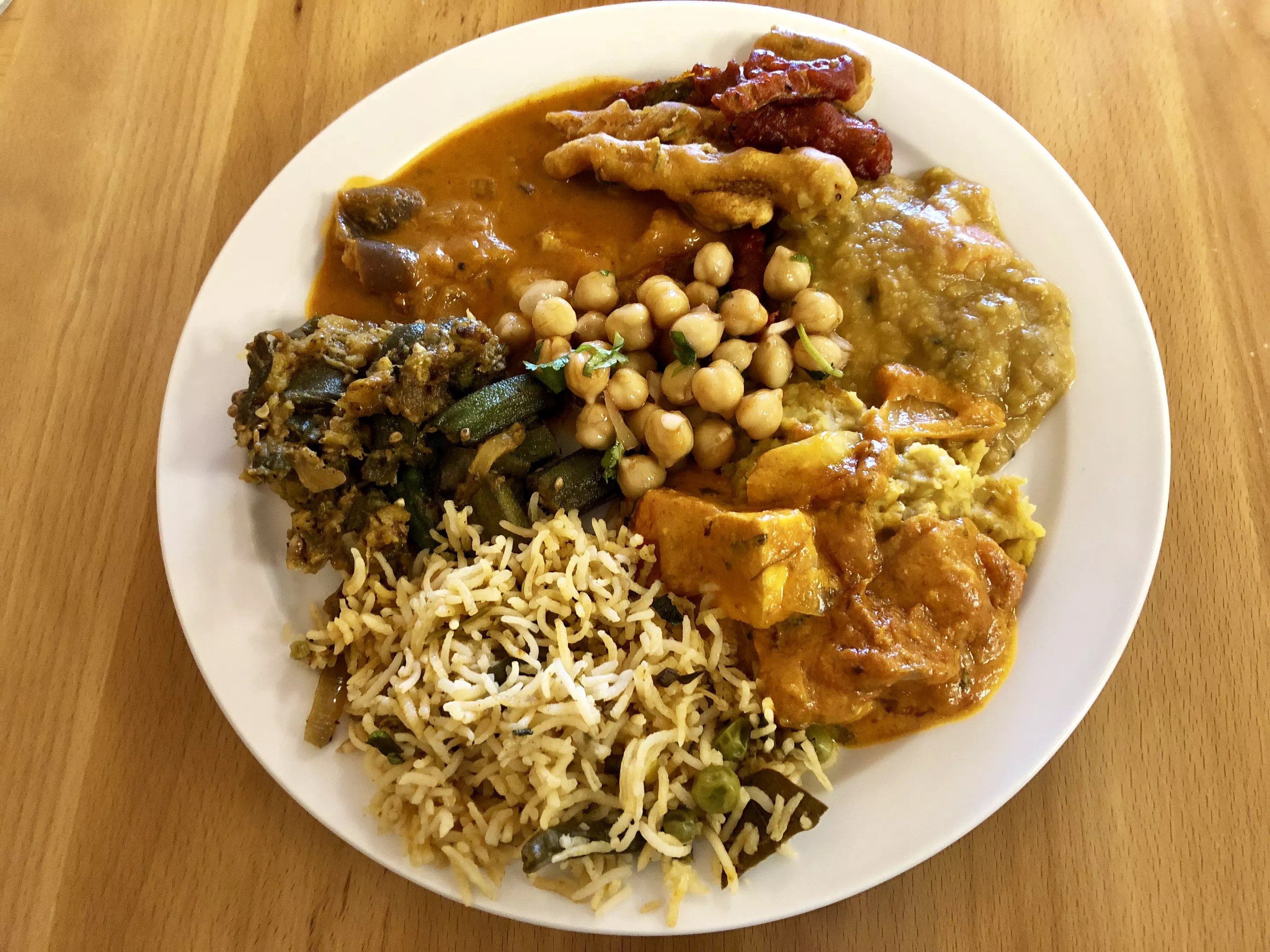 To start, there were two soups: sweet corn and rasam, a tomato-based soup. Next to the soups were the fried dishes – baby corn bajji, baby corn fritters, tindura 65, spicy fried ivy gourds, bindi fry, stir-fried okra. Other items on the buffet included dal tadka – yellow lentils sautéed with onions, tomatoes and spices – paneer butter masala and a chickpea salad.