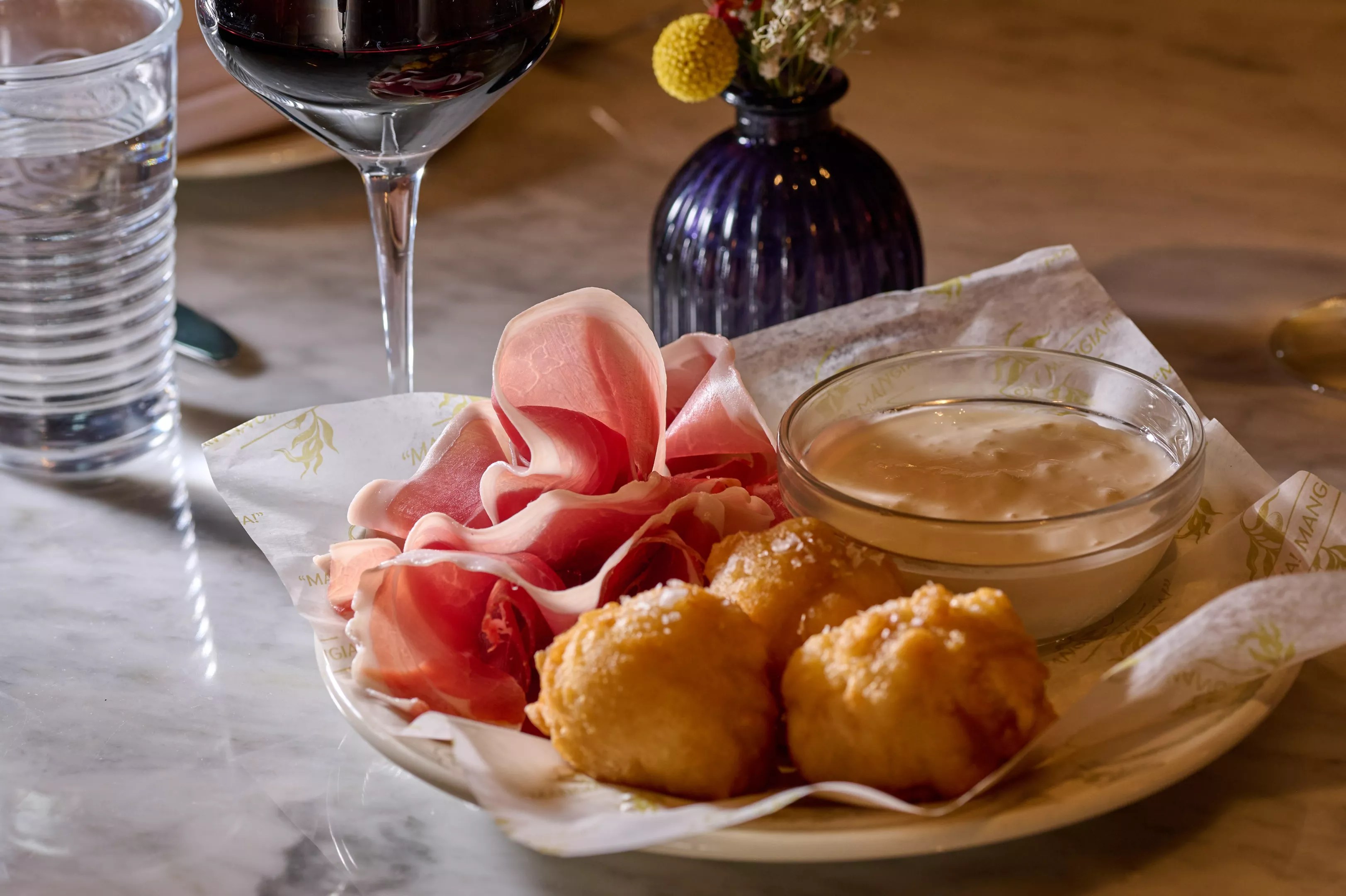 Coccoli is bite-sized fried dough served with a side of prosciutto.