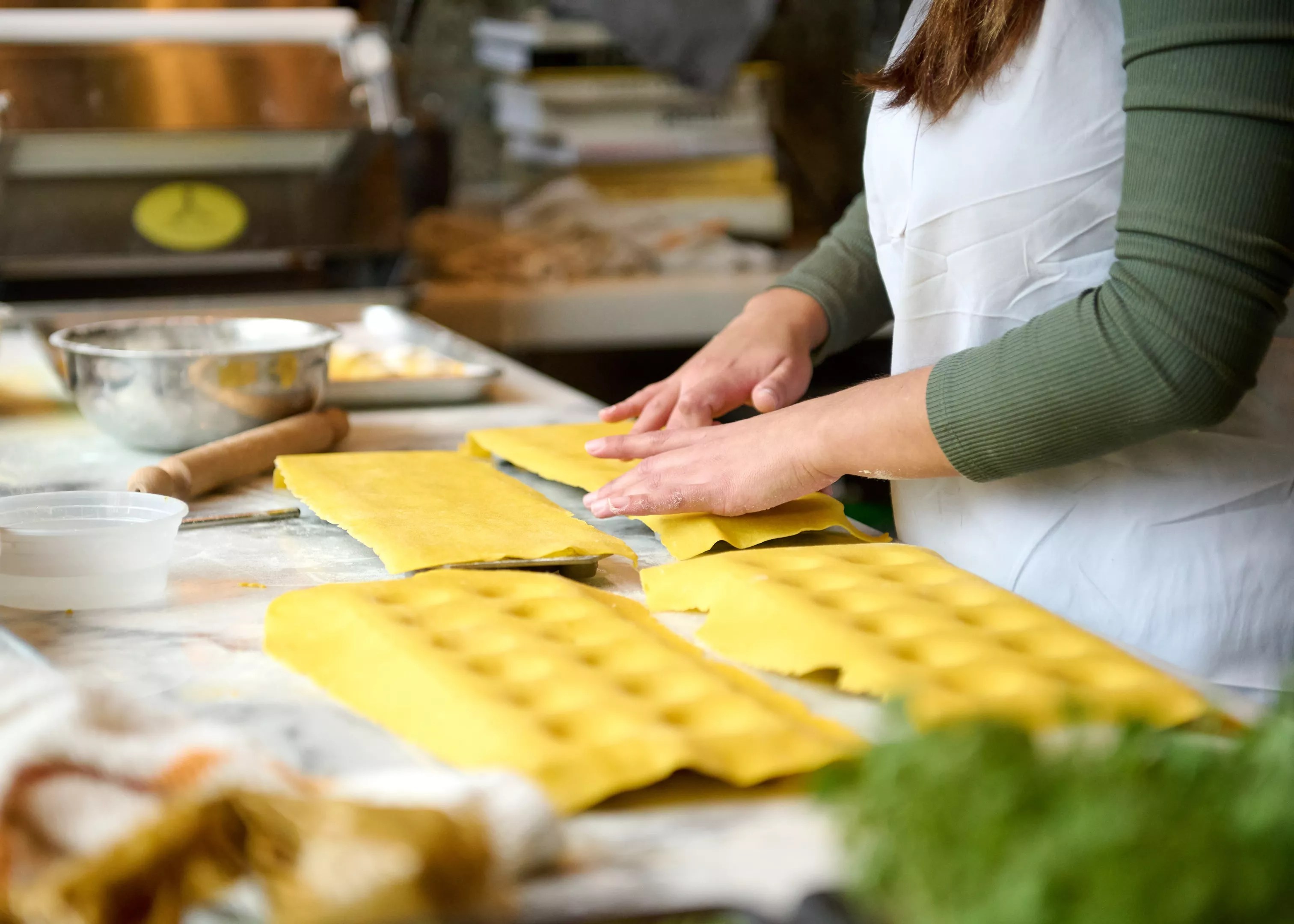 Via Triozzi is named for a street in Scandicci, Italy, a town in the hills near Florence, where Hutchinson lived in a 15th-century villa while completing a culinary program. Inspired by Hutchinson’s time abroad, Via Triozzi oozes veritable charm. From the sidewalk, large windows offer a view into a small room where pasta is made on marble counters and left to hang from racks above. Step inside past the host stand and take in the space. Soaring ceilings are adorned with tin pressings. The bar is finished in light wood tones, backed by sage green shelves that feel like a stylistic homage to an olive orchard. The dining room is just as welcoming, with cozy booths along each wall, the mood set in a blend of stucco and exposed brick that feels as if you’ve been teleported to the Old Country.
