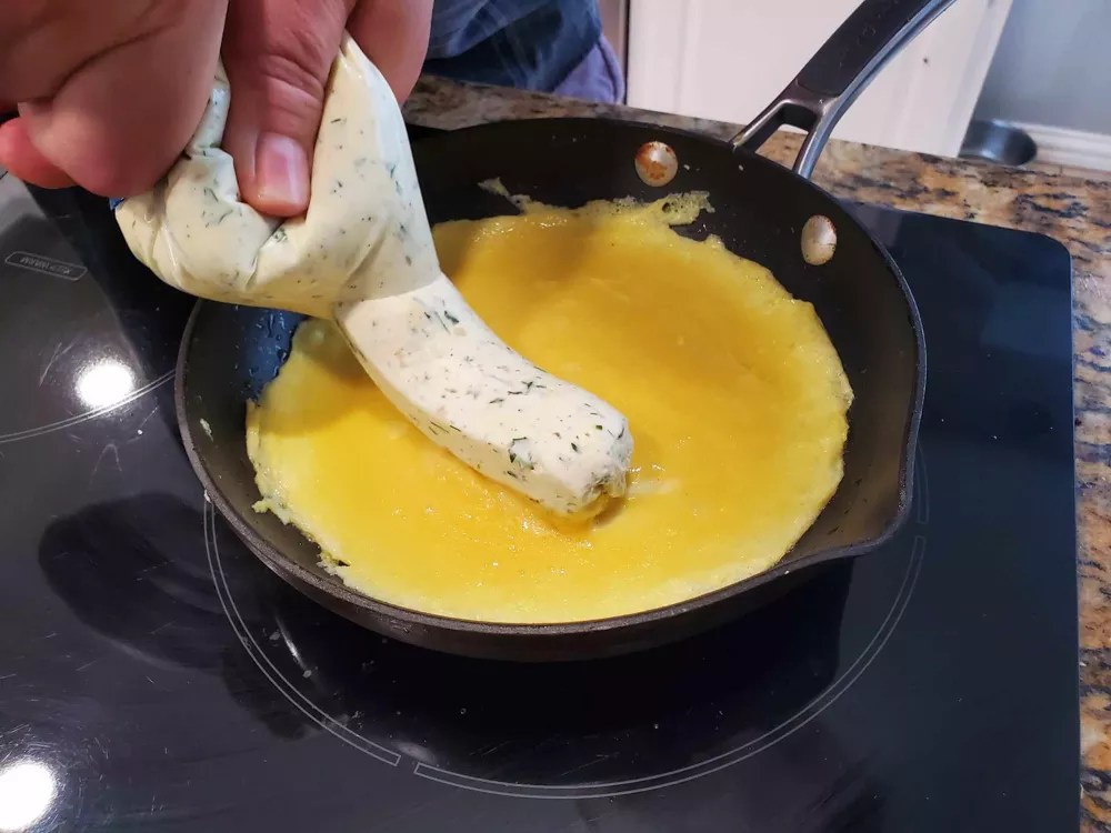 It’s not mentioned at the time, but Sydney describes the omelet to Carmy later in the episode and tells us the cheese is Boursin. You can buy Boursin off the shelf, but it’s easy enough to make on your own, and the results are spectacular. In my mixer, I blended two parts cream cheese and one part softened unsalted butter, along with freshly grated Parmesan, fresh parsley and dill, plus some dried Italian seasoning and black pepper. Again, the internet is your friend here, chock full of similar recipes for you to try. I stuffed a zipper storage bag into a glass, then scooped the cheese into the bag. After sealing the bag and cutting off one corner with a pair of scissors, I had my own amateur piping bag to add cheese to the omelet.