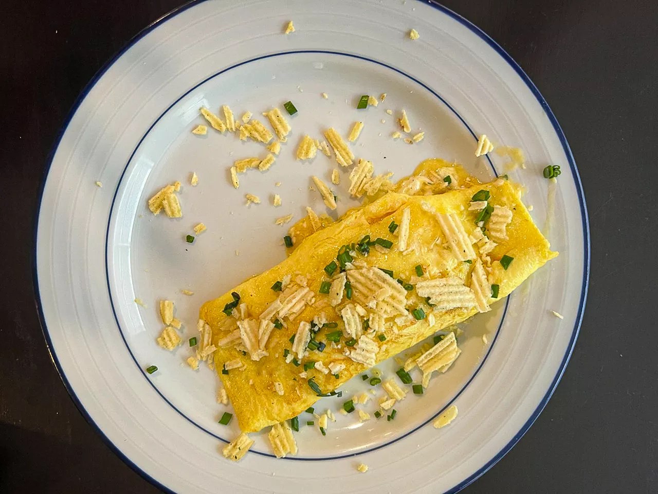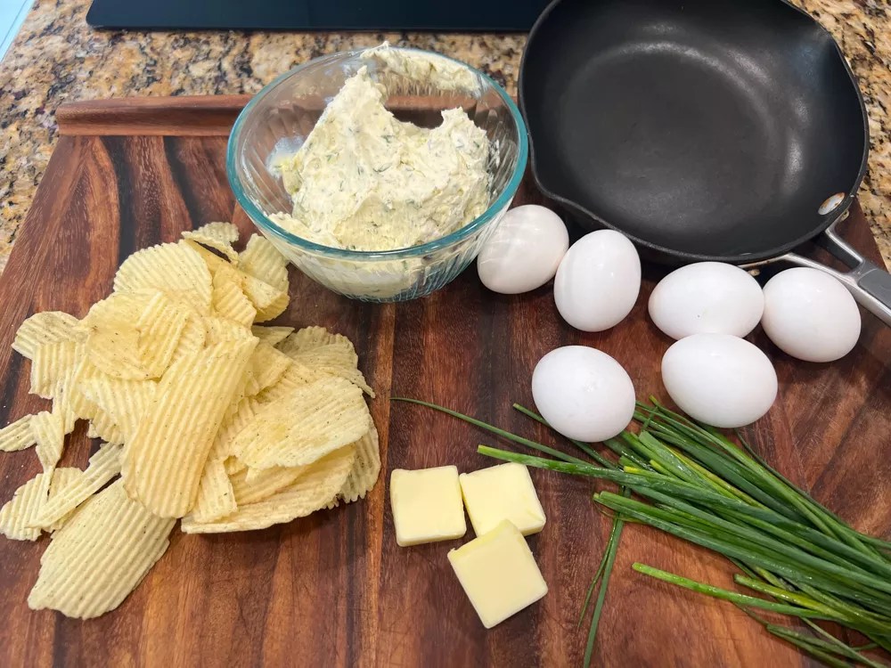 While perhaps not as picture-perfect as Sydney’s, I think my omelet deserves an Emmy for flavor. I stumbled into near perfectly cooked eggs on my second attempt, and the Boursin cheese is creamy, herby and tangy in a way that makes a perfect omelet filling. The crunchiness of the potato chips on top is a unique and playful touch.
