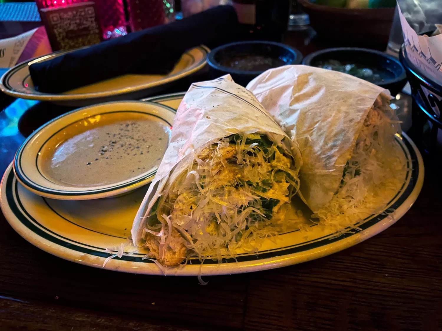 What’s wrong with the wrap is the principle of ordering it. Our dignity took a hit when we scoured the menu of enchiladas and tacos, but instead ordered a chicken Caesar salad wrap that wasn’t on the menu. Nor was it Tex-Mex.