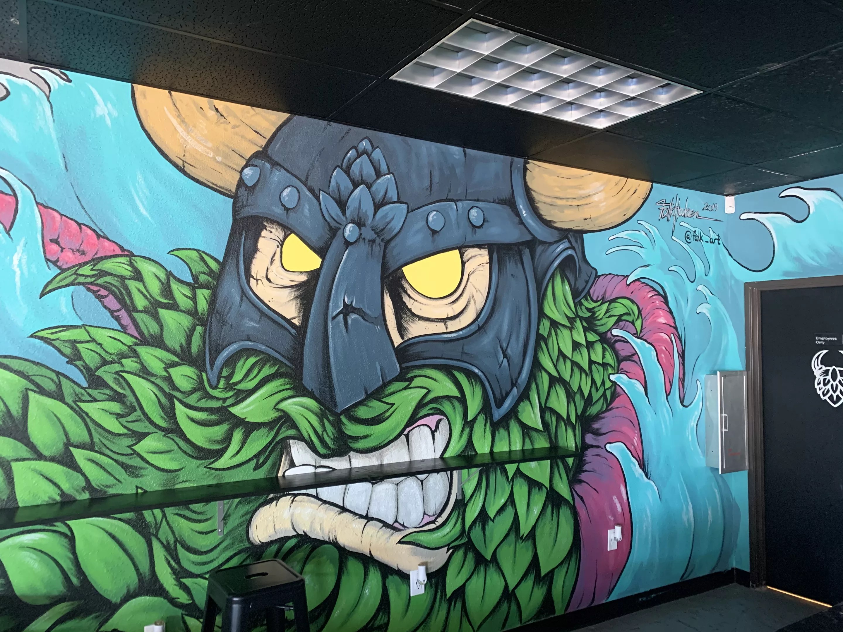 Bordering the half of the seating section of the space is a massive, vibrant tattoo art-style mural. Taking up what looked to be at least 40 feet of wall space, the mural focused on some sort of wild Viking octopus. The half of the former restaurant space, on the other side of the bar, housed the gleaming brewing tanks and equipment, completing a highly pleasing art and science vibe combination.