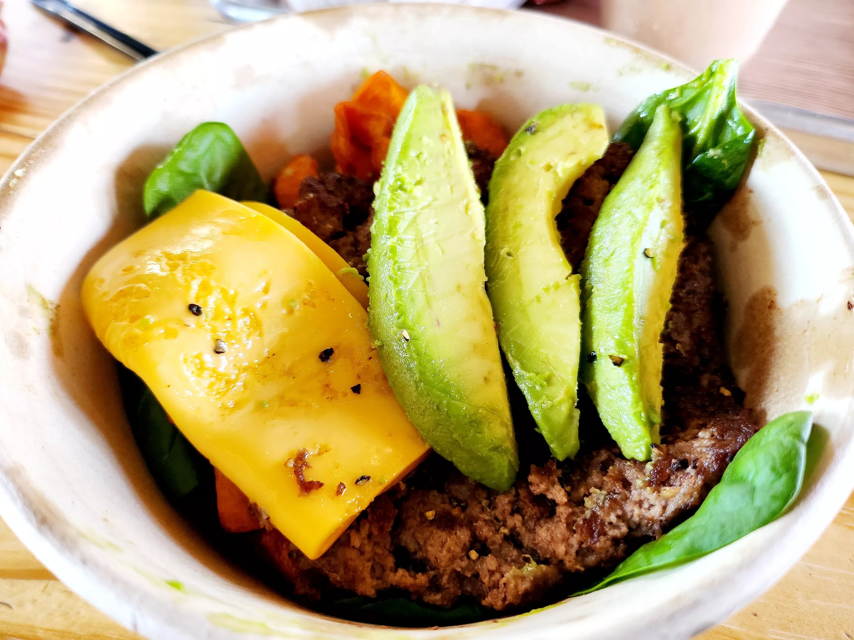 We also vouch for the Fredericksburger ($12.99). It’s topped with tangy and spicy sauerkraut, Hat Creek’s signature Happy Sauce and two slices of American cheese. One of our dining partners went with the Paleo burger bowl ($7.59), a single beef patty in a bowl with sliced sweet potatoes, American cheese and avocados on a bed of baby spinach. A solid option for carb-cutters.