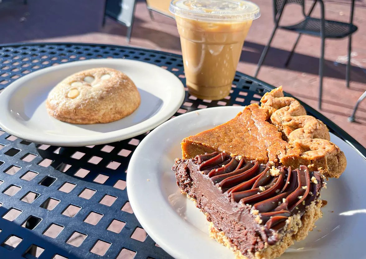 In addition to coffee, shelves are lined with a variety of baked goods, both house-made and locally sourced. The chai snickerdoodle cookie called to us from behind the glass case, as did the generously-filled berry tarts. A variety of brownies, cakes and larger-than-expected cinnamon rolls are also available to munch on. Enjoy your coffee with a slice of pie, sourced from Dallas’ own Emporium Pies. There are season varieties like the pumpkin pie with a gingerbread cookie crust along with the classics like the Smooth Operator, a silky chocolate truffle pie lined with a crushed pretzel crust.