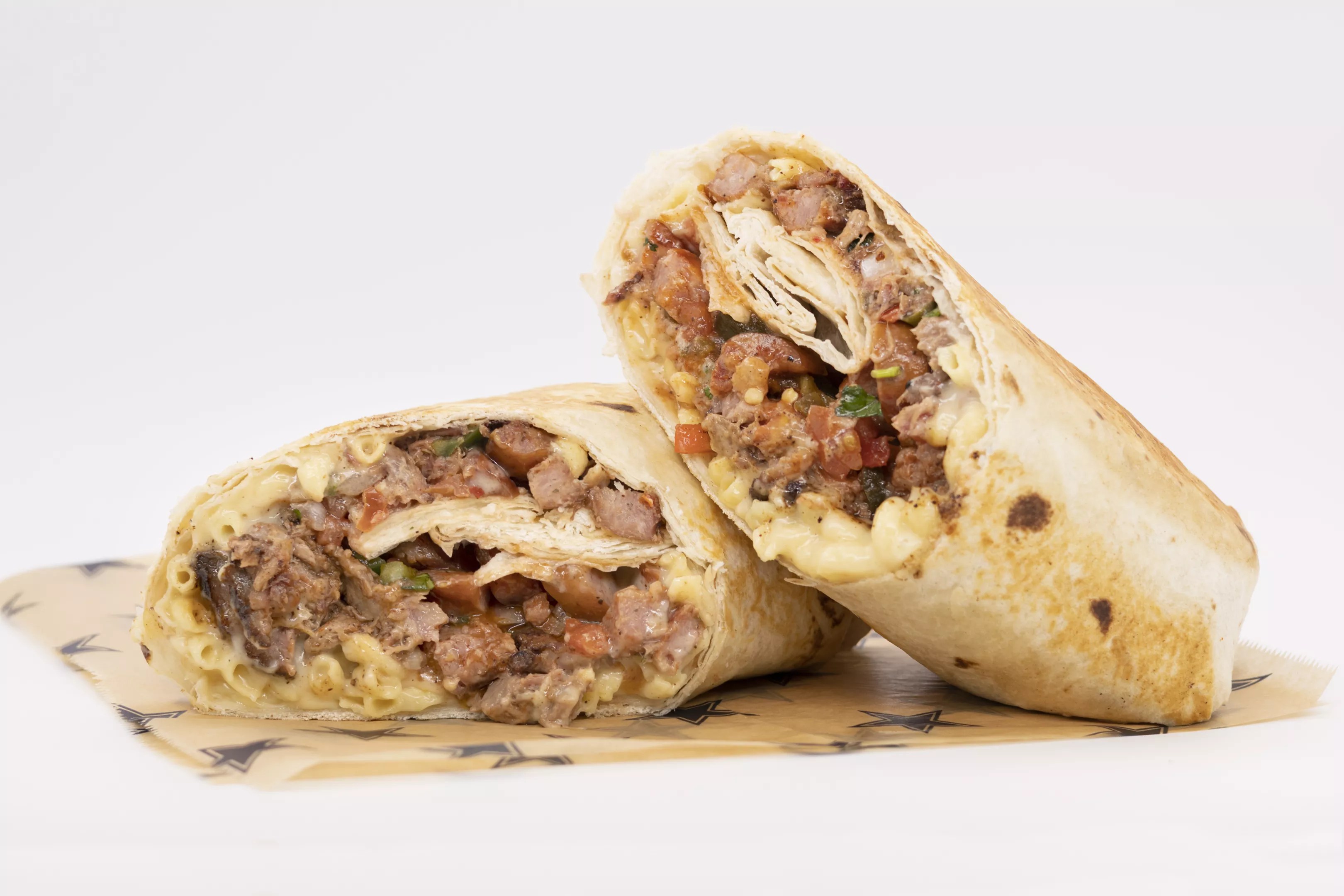 The Cowboy’s notorious mac and cheese is loaded into a burrito with brisket, jalapeño pepper jack sausage and pico de Gallo, which is all stuffed inside a large tortilla. (Photo at top.)