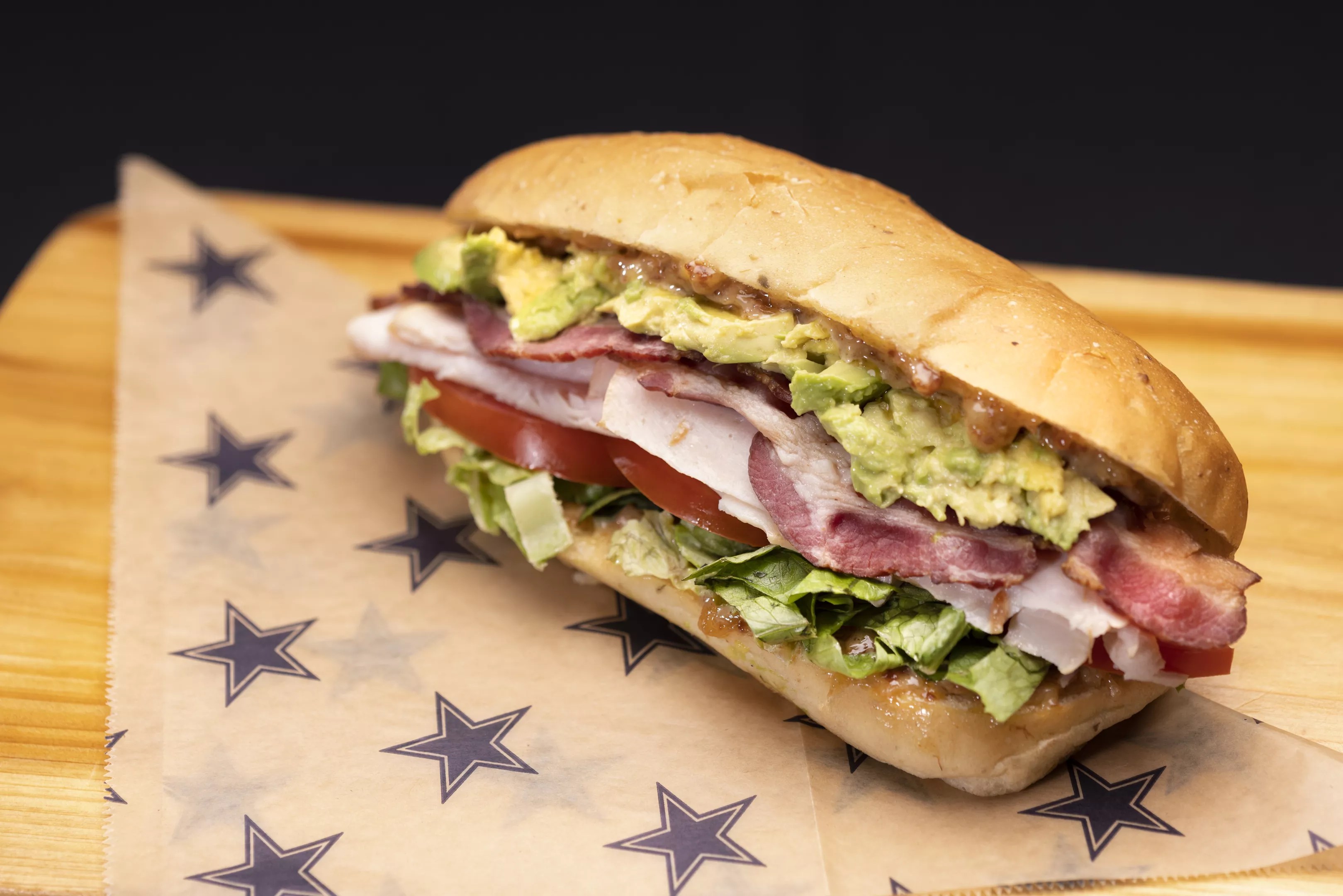 The classic turkey sandwich is loaded with bacon, avocado, lettuce and tomato with house-made bacon jam aioli. It’s served on a locally baked Italian herb hoagie.