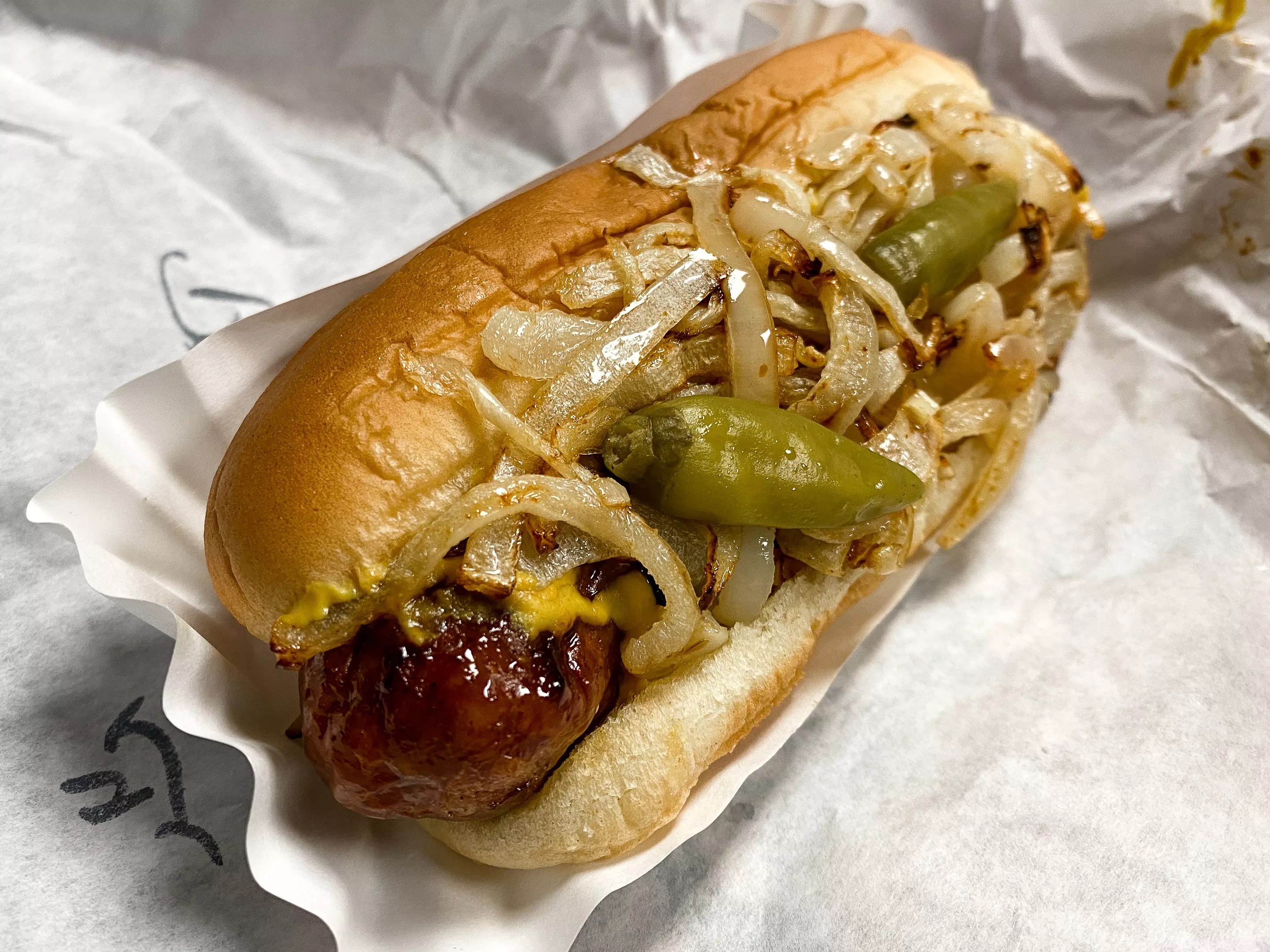 A Maxwell Street Polish sandwich is a Chicagoland staple and consists of a grilled or fried Polish sausage served in a bun and topped with yellow mustard, grilled onions and sport peppers. It’s widely believed to have originated at Jim’s Original hot-dog stand in 1939 at Maxwell and Halsted streets in Chicago’s old Maxwell Street Market District.