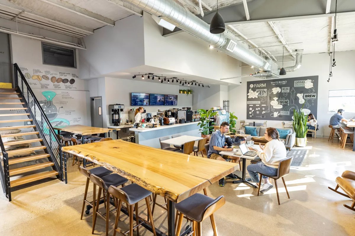 White Rhino Coffee plans to open five more shops by 2025, all of which begin operations out of this roastery and its new cafe.