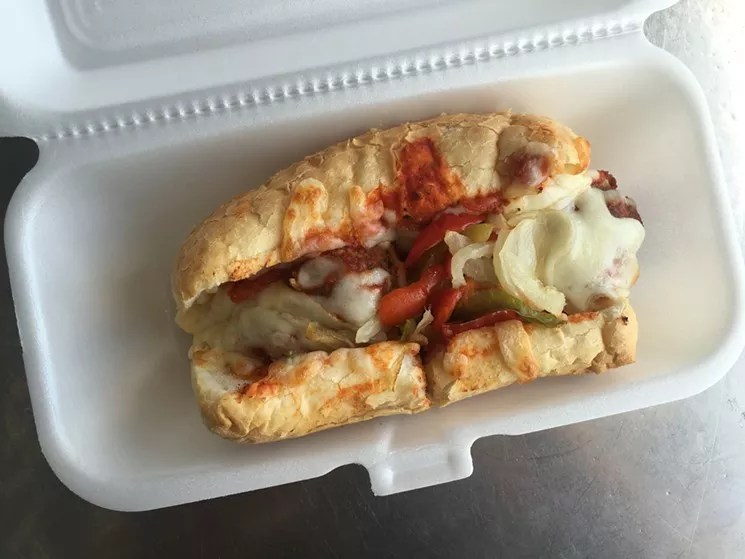 The no-fuss, under seven-buck meatball sandwich – with onions and peppers – at Jimmy