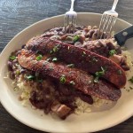 When you enter Bongo Beaux’s, you’ll hear sounds of accordions and fiddles from the Zydeco music playing in the background and see gold, purple, and green accents all over the place. The stuffed raccoons playing a serious game of Bourré are an awesome addition. And the most eye-catching piece of décor is the giant mural of Jesus Christ painted on an entire wall inside the restaurant with gold spray painted cherub angels hanging from the rafters. For starters, a sharable option is the Breaux Bread, which is a French bread roll stuffed with crab, crawfish, andouille, cheese and topped with their Crackfire sauce. If you’re dining solo, it is filling enough to act as your entire meal. Looking for something not quite as filling? The hush puppies are a great choice to start without ruining your appetite. Outside of crawfish season, other great options include their red beans and rice, gumbo, jambalaya and the Drowning Catfish. The red beans and rice are served with a generous portion of creamy red beans and roasted pork on top of a fluffy bed of rice with one whole link of sausage sliced in half and grilled. The gumbo has a dark roux and can be ordered as a cup or a bowl.