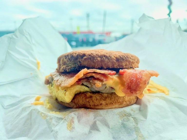In the land of Goodfriend Package, meat is king. The breakfast and lunch menus are big and bold: Sausage or bacon biscuit sandwiches, corned beef and hash, pancake (literally singular), a road-house looking scrambler, and – wait for it – scrapple. Scrapple! Scrapple is, typically, a loaf of meat made from leftover pork parts. Good morning to you, scrapple! Lunch includes simple, tried-and-true delights.The menu is anchored by the classics: B.L.T, pastrami on rye, roast beef, club. There’s only one sandwich on this menu you likely haven’t had before: the mushroom pastrami on rye. Portabello mushrooms are brined for three days, seasoned and smoked, creating a texture and flavor profile that is as close to meat as any vegetarian could hope for – though non-vegetarians shouldn’t shy away from adding a few strips of their house-made bacon. The sandwich is made all the more indulgent with Swiss cheese, house sauerkraut and “Million Island” dressing on marbled rye. All of the bread comes from Empire Baking Co., but just about everything else – from the corned beef to the biscuits, sausage gravy and even condiments like butchers’ mustard and bacon fat mayo – are made in-house at the commissary kitchen.