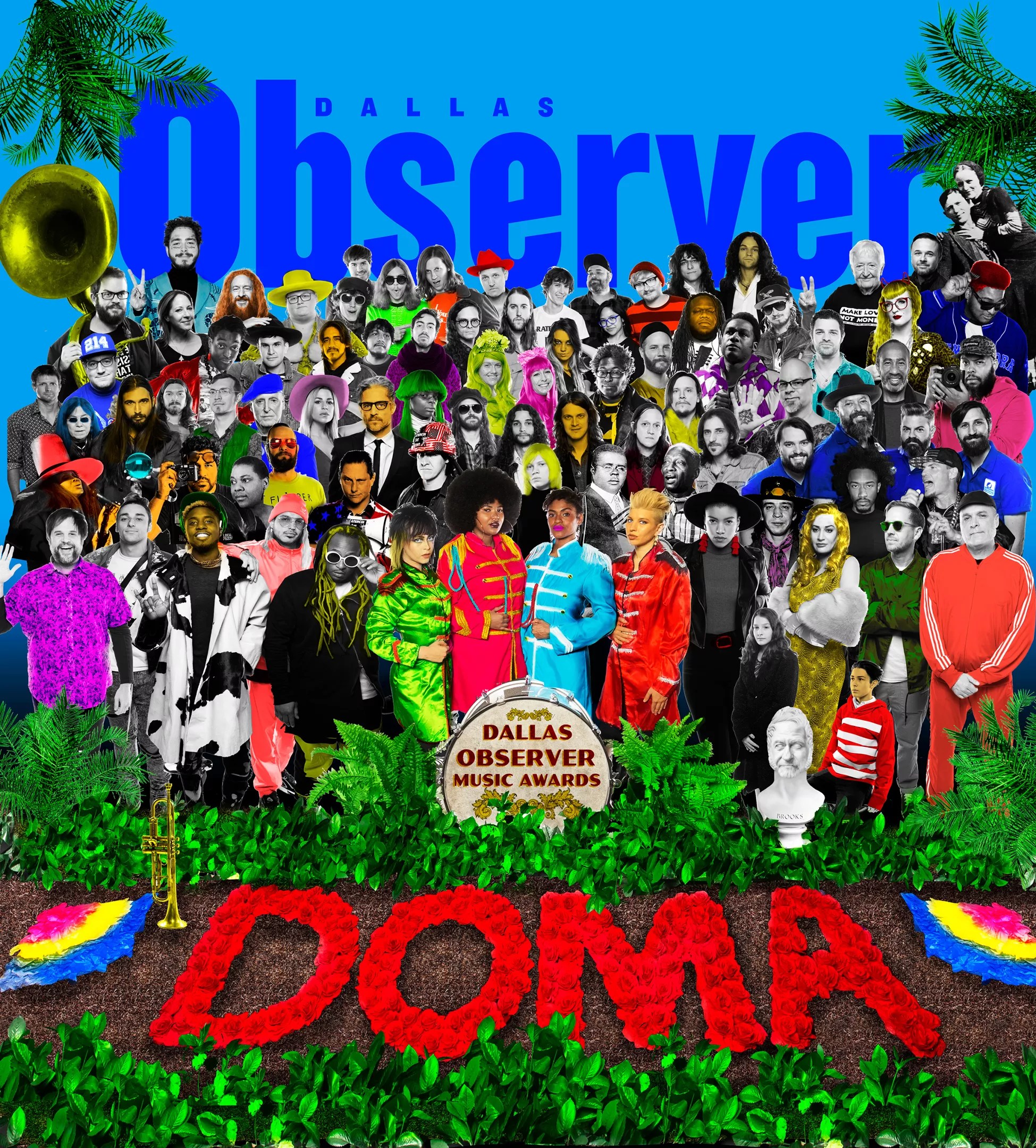 Sealion’s Hunter Moehring remarked about how rare it was to see so many artists together without anyone having to work or perform. Photographers Sarah Reyes and Daniel Driensky from creative agency Exploredinary pulled off the ambitious concept, through a detailed labor that included making props – like the letters that spell out “DOMA” instead of “Beatles,” which required the individual arrangement of close to 200 flowers – and the design of other Easter egg details. For instance, the bust on the right of the drum is the face of Observer music photographer Mike Brooks. It’s a snapshot of the year in Dallas music, with its main contributors, past and present.