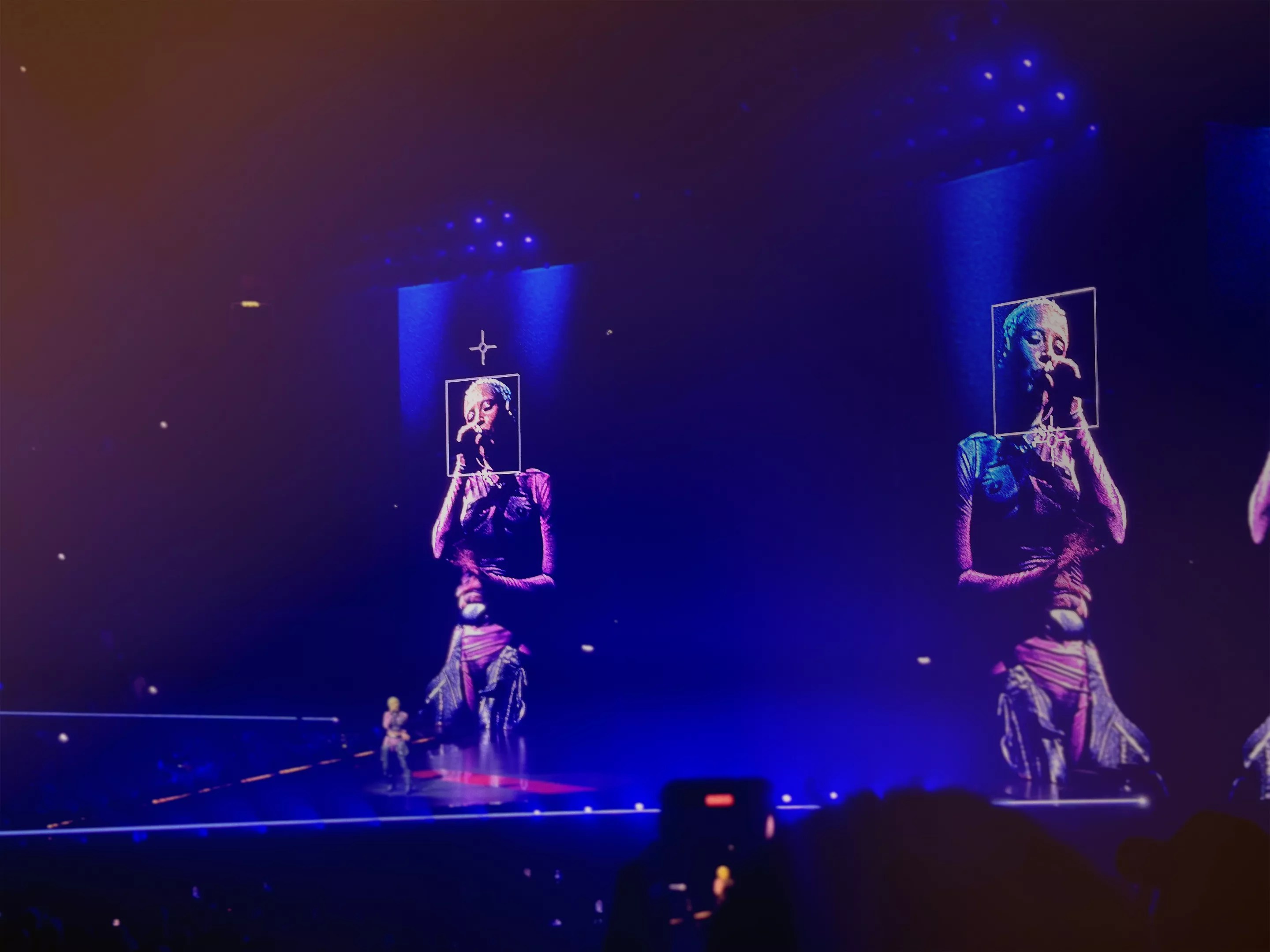 Several moments appeared to be posed with the giant LED screens in mind. During “Attention,” her backup dancers were arranged in a line in front of the camera with their arms in a circle above their head. On the lyric “look at me, look at me / you looking?” she looked down the tunnel of arms and into the barrel of the lens. Ironically, this was a moment that only worked if you weren’t looking directly at her.