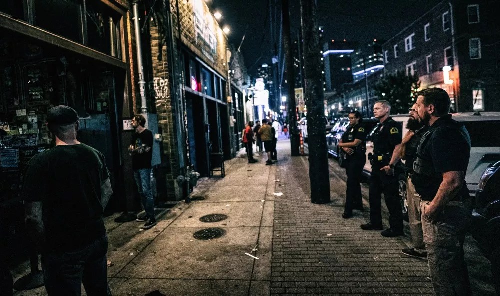 Police stand outside Three Links on Elm Street. Maybe they were looking to score some smokes.