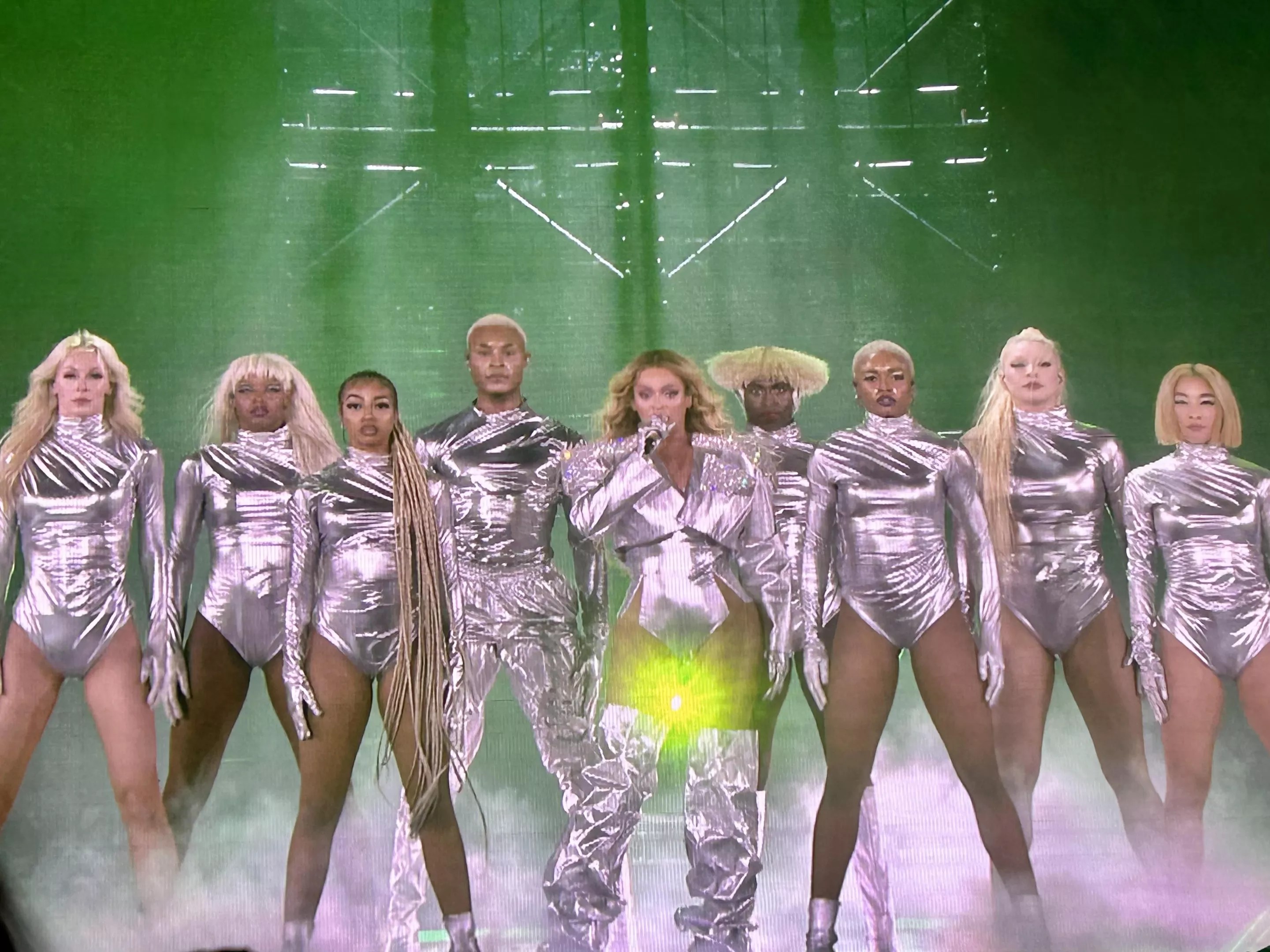 A runtime of three hours made the 1.5-hour delayed start well worth it. On the RENAISSANCE World Tour, Beyoncé has delivered production values beyond our wildest dreams, including (but hardly limited to) the mind-blowing element of costuming herself AND her dancers with arguably the year’s most revered achievement in fashion design: the geometric silhouettes of Japanese brand Anrealage by Kunihiko Morinaga, made from UV-activated color-changing fibers that lit up Paris Fashion Week and the internet this spring. The magnitude of being in the same room as such iconic custom couture was by no means lost on such a stylishly outfitted audience.