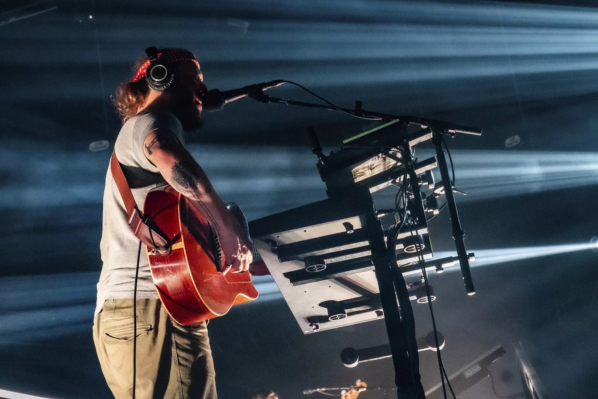 That thread of acknowledgment underpinned the songs, which could spin from bleak to beautiful in an instant. “Jelmore,” from the band’s 2019 album i,i, began as a glitchy, scattered cloud of sounds – a song that felt and sounded shattered before it even began – before Vernon, wearing a bandana and black headphones clamped securely over his ears, stepped to the microphone, and began to sing, his voice warped and distorted: “We’ll all be gone by the fall/We’ll all be gone by the falling light.”