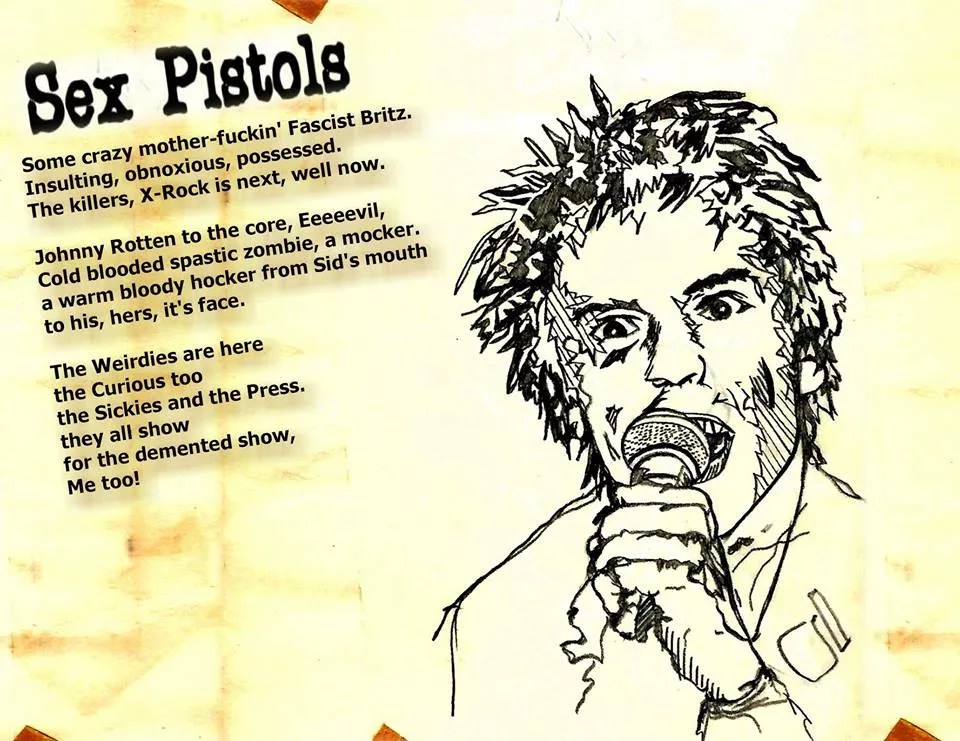The Sex Pistols in early 1979 played the Longhorn Ballroom, a country and western dance hall once owned by Bob Wills and later by Jack Ruby. (The marquee that night advertised Merle Haggard as the next show.) In attendance and right up front (along with legendary Rolling Stone photographer Annie Leibowitz and Dallas punk band guitarist Barry Kooda) stood a young Frank Campagna. Campagna, who is today’s godfather of Dallas art, documented his recollection of the event. The memory is forever preserved inside a prickly poem alongside an illustration of Sex Pistols frontman Johnny Rotten.