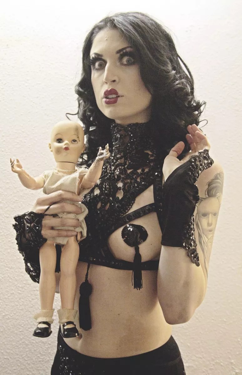 What you should know: Ghoulish diva who loves horror movies. Drag queen extraordinaire May May Graves recently claimed Scorn as her child and protégé. She collects creepy dolls now to store souls in them later – you’ve been warned.
