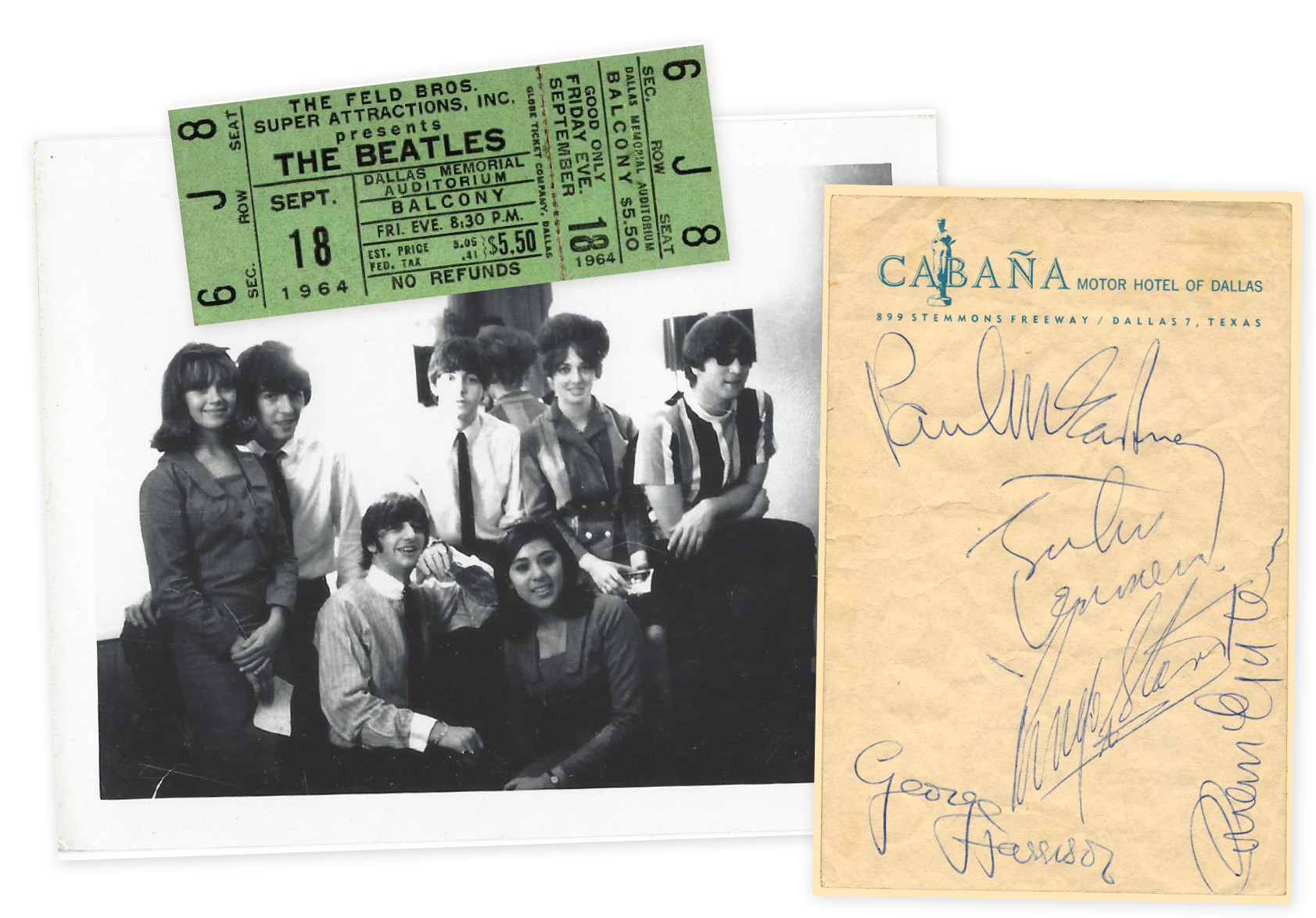 A polaroid of the Beatles Fan Club meeting the band in Dallas; a ticket stub from the show; Beatles’ autographs on hotel note paper from the night.