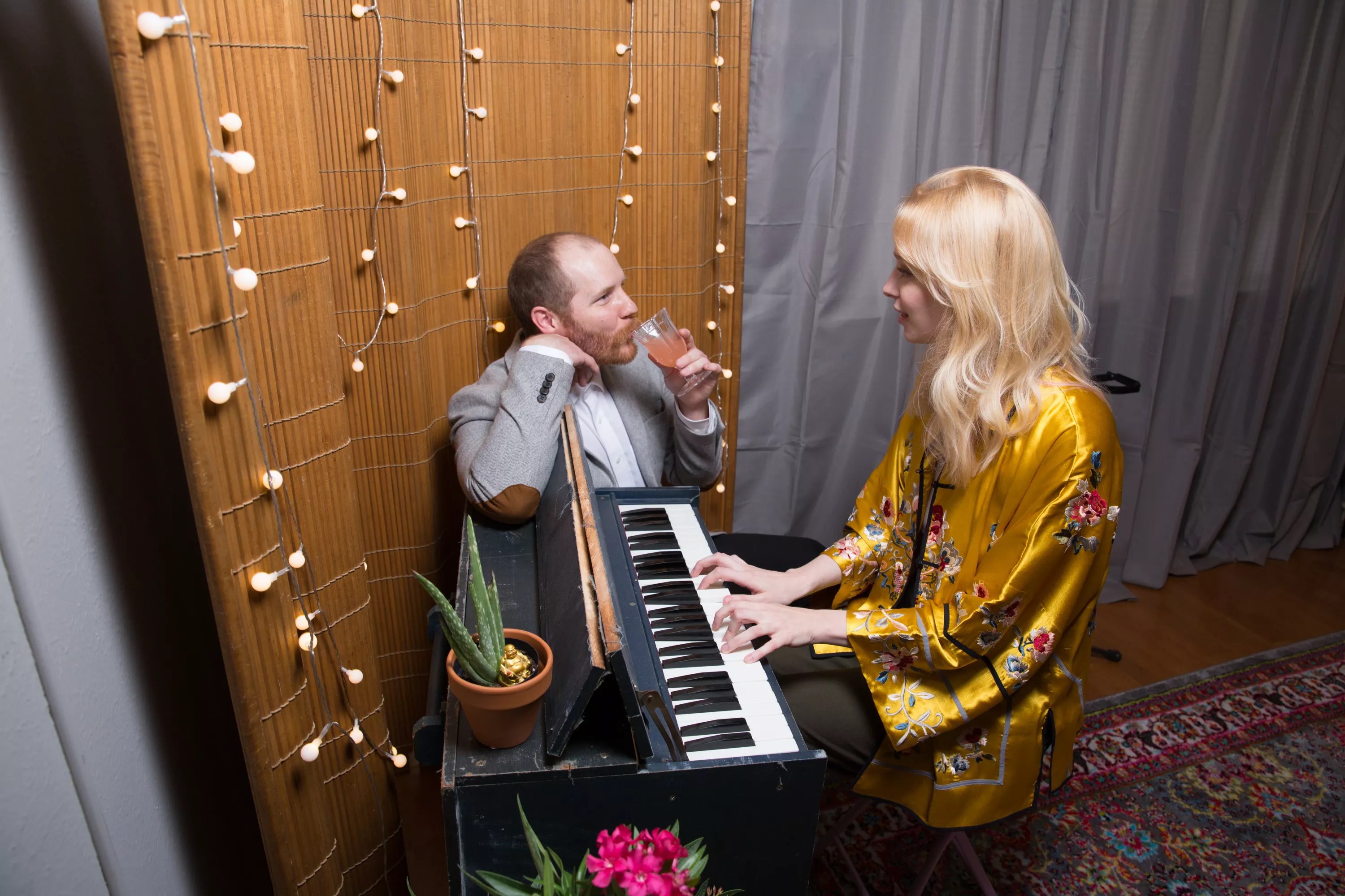 The couple moved into their current place in March, and it’s sprinkled with teensy string lights that pop-up like fairy dust in random corners. Their living room wall is barricaded with amplifiers, perhaps meant to protect Metcalf’s adjacent WWII-era pump organ. The only framed photos in sight are a standing group shot of four U.S. presidents and a photo of Dr. Seuss on the kitchen counter. Metcalf shows off their new fern in the living room.