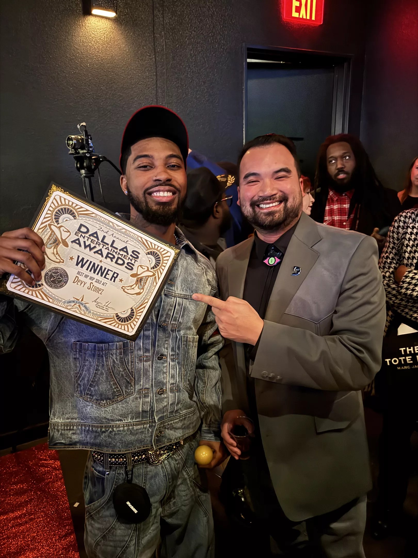Music editor Eric Diep congratulates Devy Stonez on winning Best Hip-Hop Solo Act at this year’s Dallas Entertainment Awards.