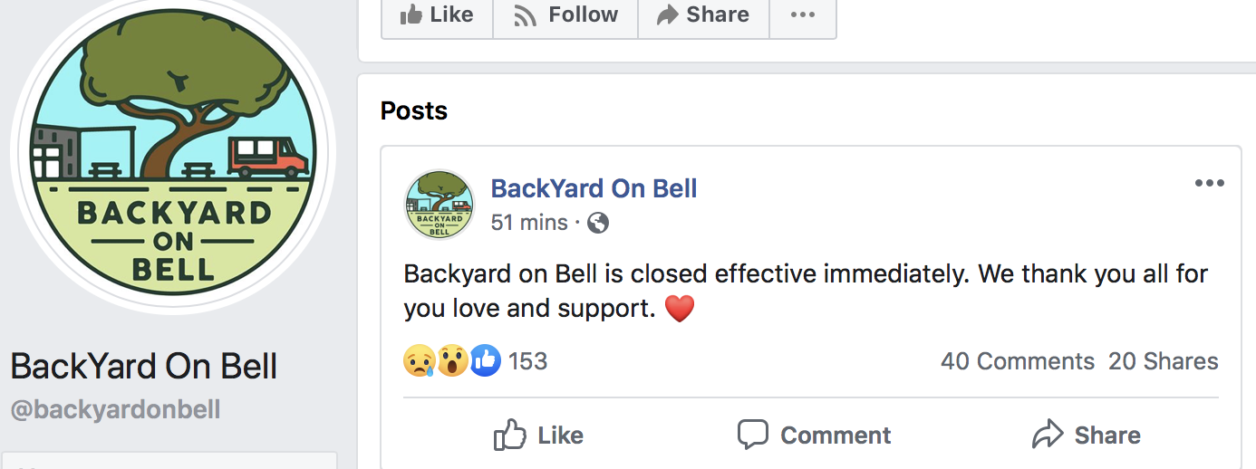 As people loaded stage equipment and other pieces of the venue’s interior onto trucks on Tuesday afternoon, an official statement confirming the venue’s closure was posted to its Facebook page. “Backyard on Bell is closed effective immediately. We thank you all for your love and support,” the post read. The picnic tables still fill the outside area, but the stage is gone.
