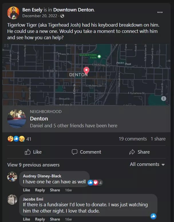 Members of the Facebook group Denton Downtowners responded to a post in December from a fan who wanted to make sure Josh “Tigerhead Guy” Musgrove received a tip that was left for him. The group often quickly responds to just about any post or update on Musgrove.