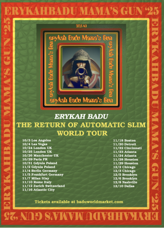 Badu also announced international dates for The Return of Automatic Slim World Tour, celebrating the 25th anniversary of her revolutionary second studio album, Mama’s Gun. The tour starts on Oct. 3 in Los Angeles and then heads to the U.K., Germany, Italy, and Switzerland. If you choose to see her closer to home than overseas, her Dallas date is Dec. 10 at The Pavilion at Toyota Music Factory.