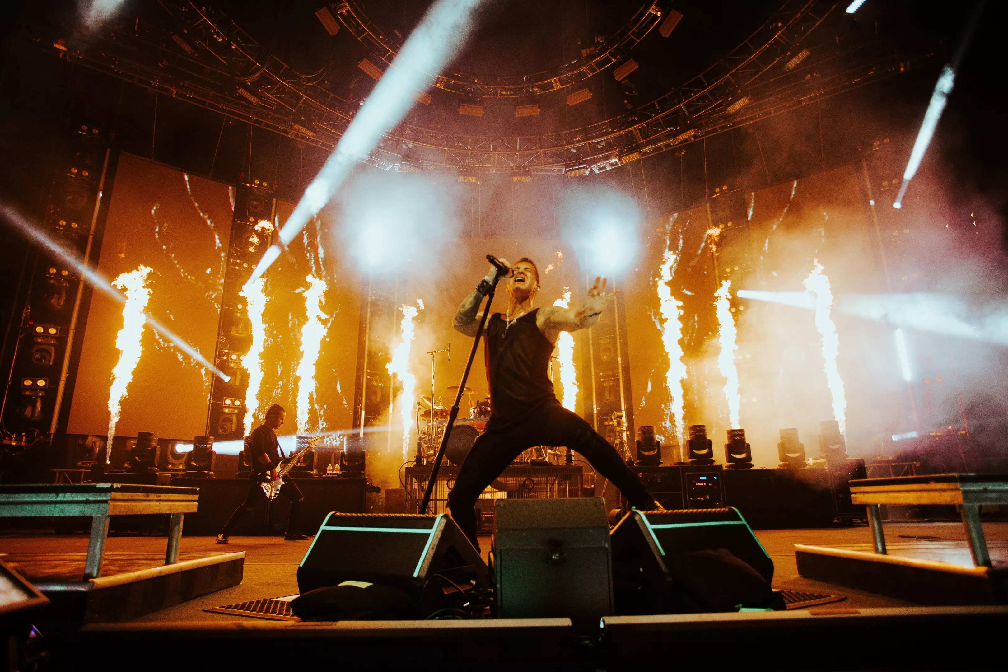 All of it unfolded across a stage that leaned heavily on the tried-and-true: gouts of fire behind the band, plumes of fog blasting in front, a fierce drizzle of sparks on occasion and everything buttressed by a panoply of video screens and banks of ceaseless lights illuminating every last corner of the room – a frenzy of visual overload to bolster songs about strife, surrender and second chances.