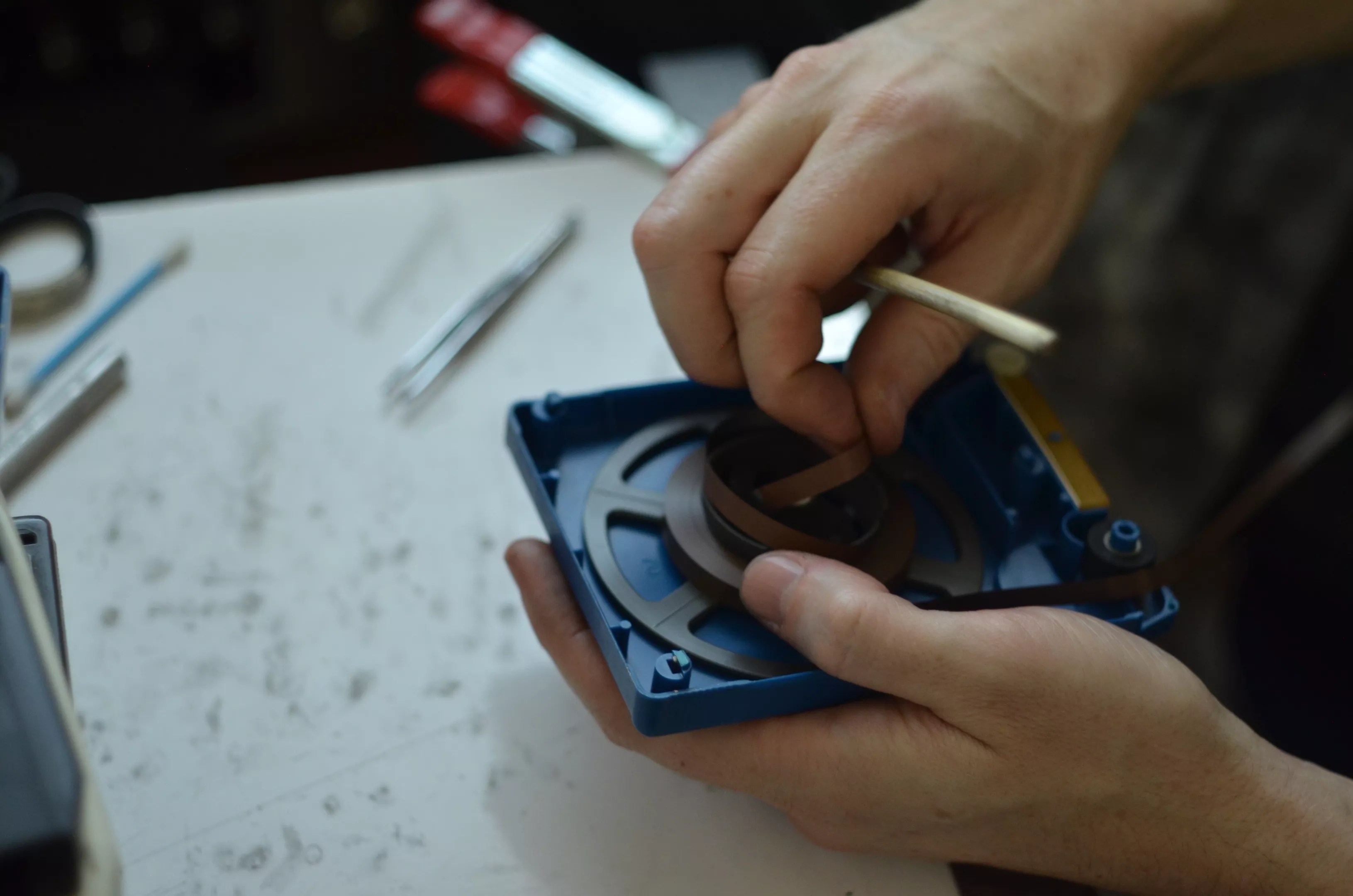 In a back room of a janky old house in Fort Worth, Nathan Brown, founder of Dead Media Tapes, and his two friends, Ryan Elmore and Ben Hance, mass produce eight-track cassettes by hand. In what Brown calls a “sweatshop,” the trio work on their biggest order yet – 1,000 copies of a new release by the Swedish band Ghost. The floors are covered in plastic wrap, and the walls are lined with boxes of cartridges and loose tape.
