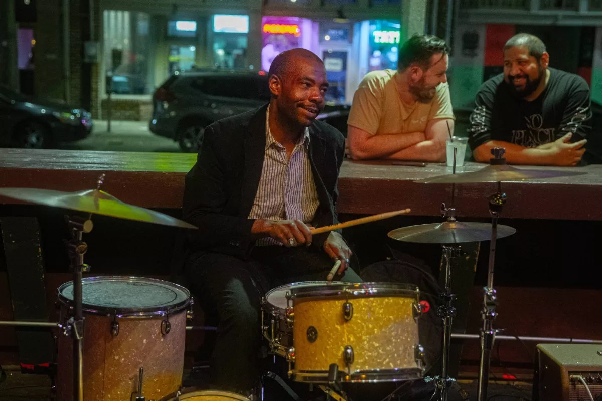 Justin Hoard plays drums as people pass by outside.