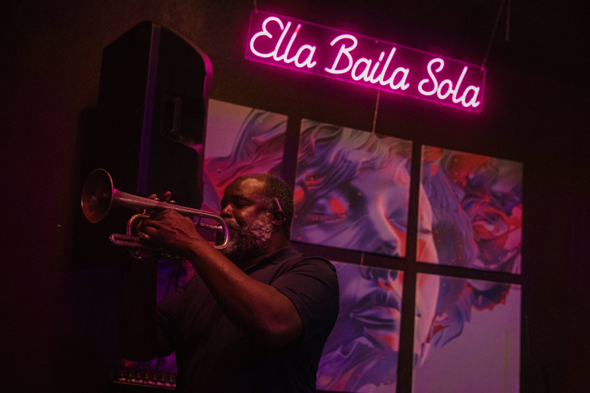 Jacob Hernandez and Justin Hoard lock-in while Charles Mills plays trumpet.