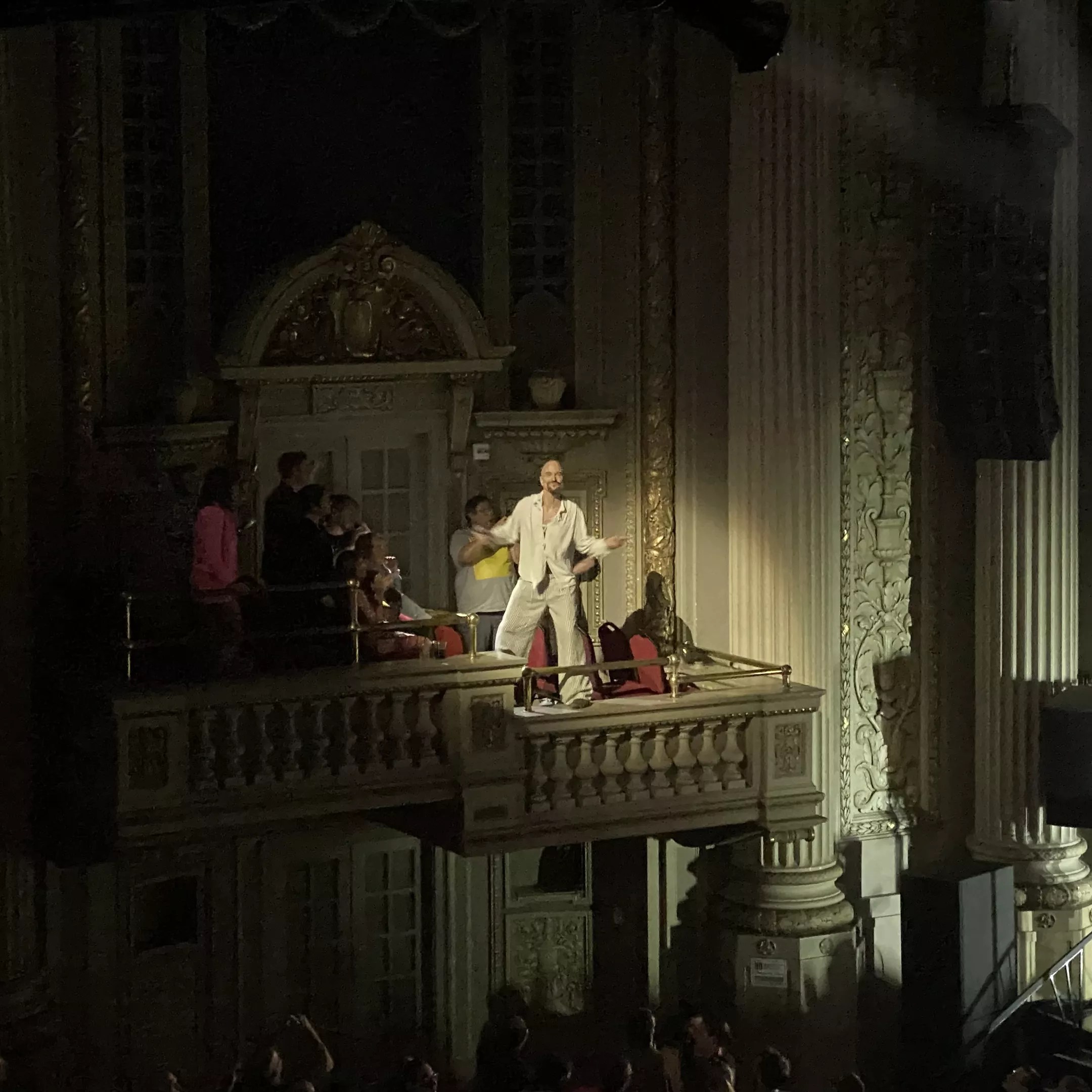 Booth highly engaged the audience with time spent walking through the aisles to serenade and dance with audience members. Toward the end of the set, Booth even disappeared to run up the back stairwell and emerge again in the stage-right opera box. He walked the ledge in a daredevil maneuver, singing down on the crowd and dancing along with the band while attendees simultaneously cringed for his safety and roared in response to the display of showmanship.