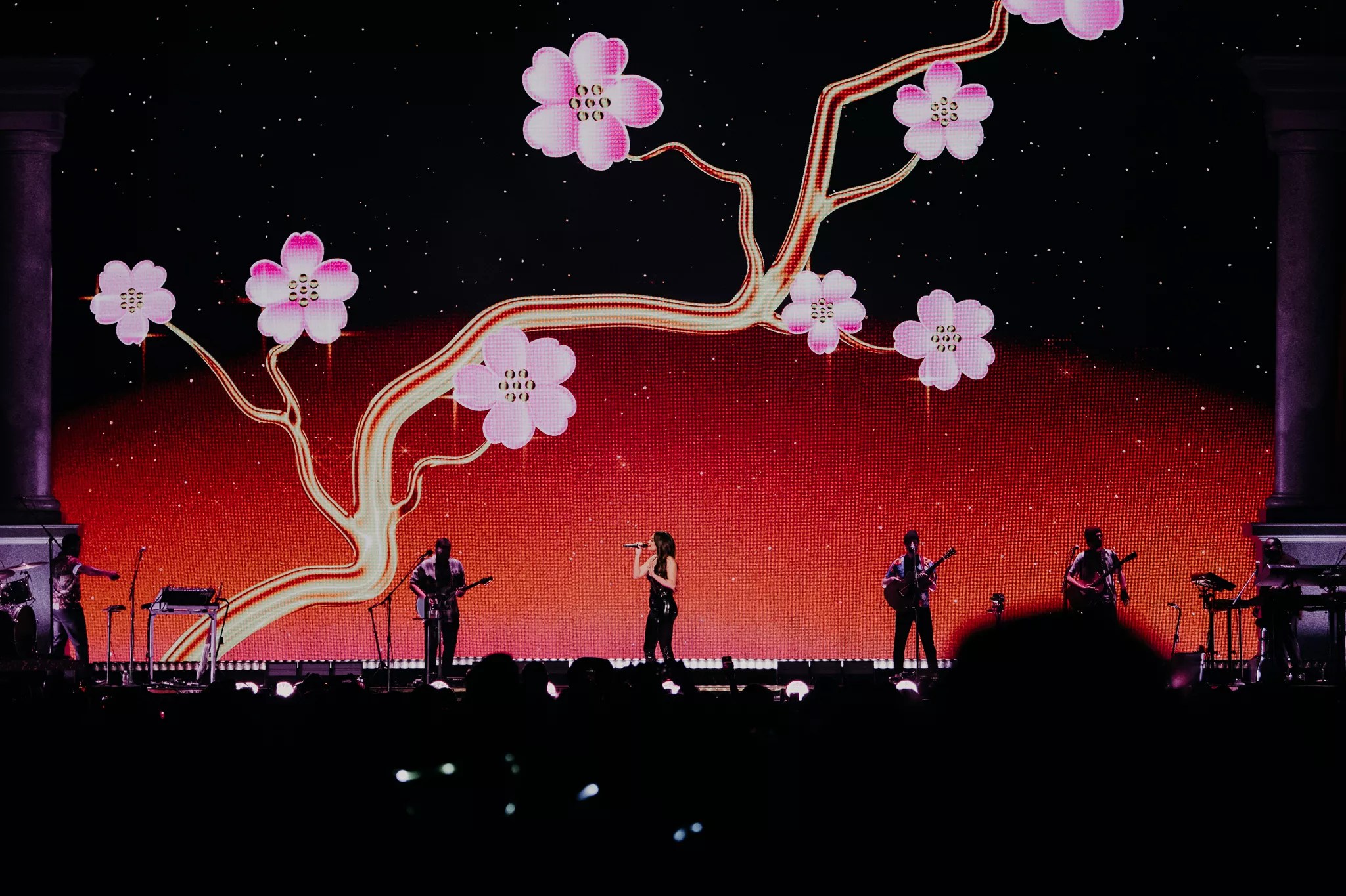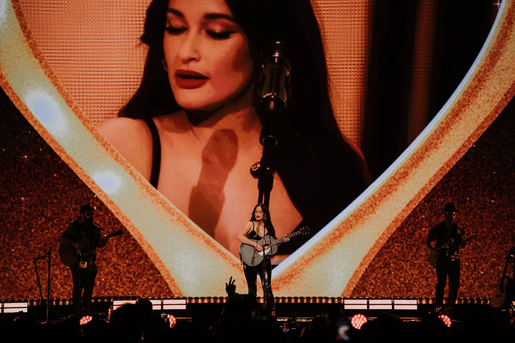 As Musgraves emerged from a blinding white light between the enormous scarlet curtains to begin the show, singing “star-crossed,” a literal flaming heart materialized behind her. She stood upon a heart-shaped LED screen at the foot of the expansive stage, outfitted with a grand proscenium, her seven band members surrounding her. A disco ball near the back of the arena floor striated the room with light during a hypnotic “Space Cowboy.”