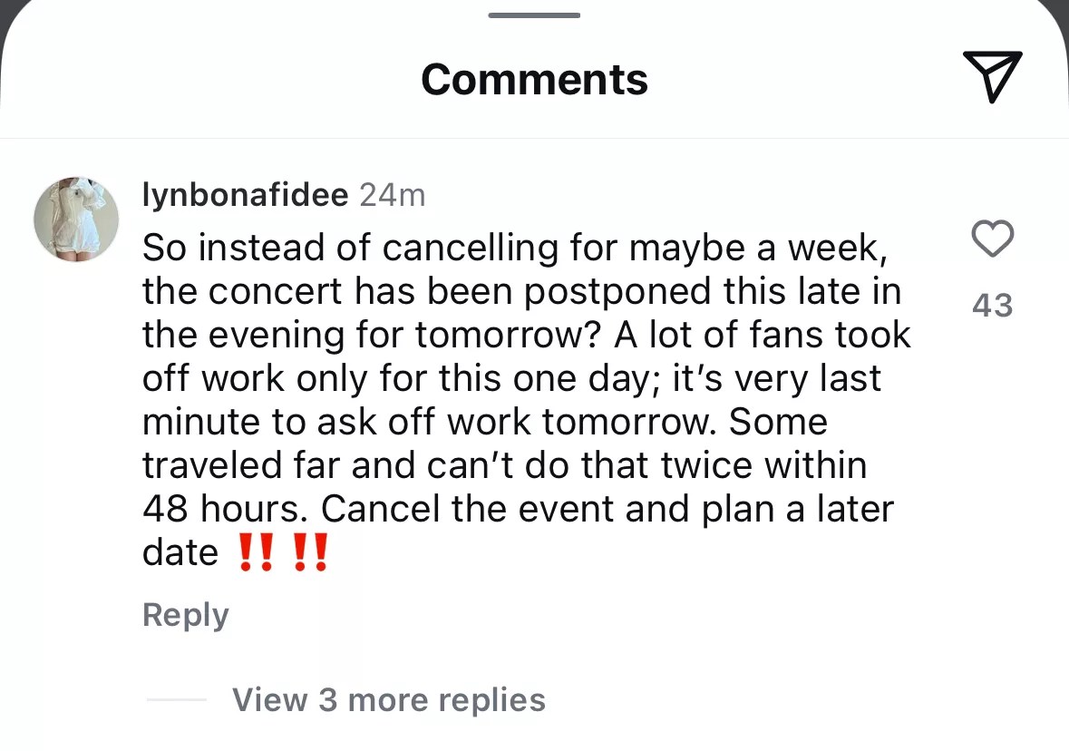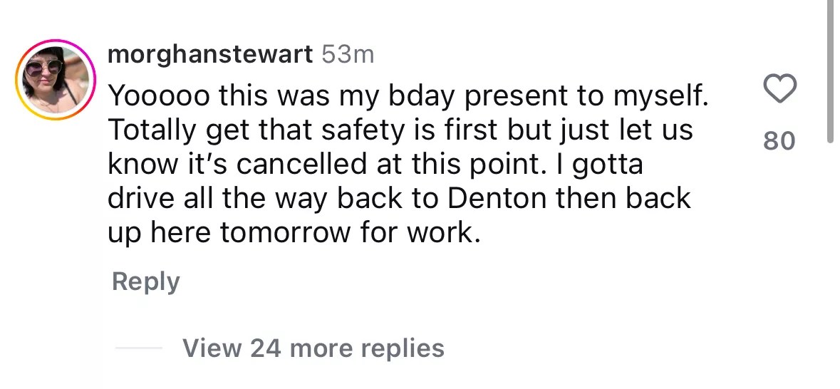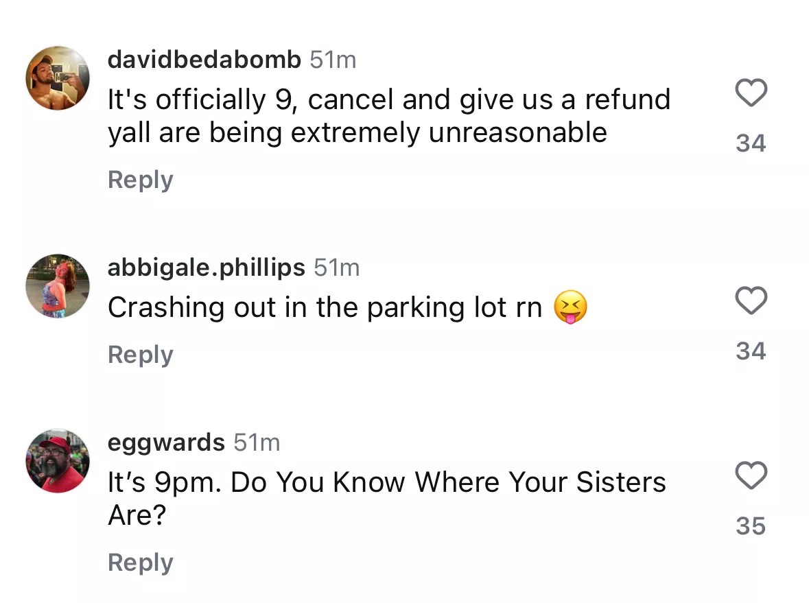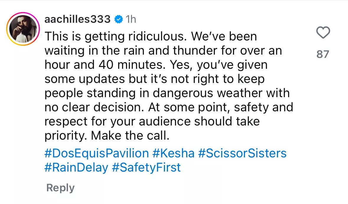 As it neared 9 p.m., fans were getting understandably upset over the prolonged update, as Dos Equis Pavilion hadn’t announced they were canceling the show yet. Fans moved to an earlier Instagram post announcing the show was tonight, and ironically stating this was a rain or shine event. The comments didn’t stop.
