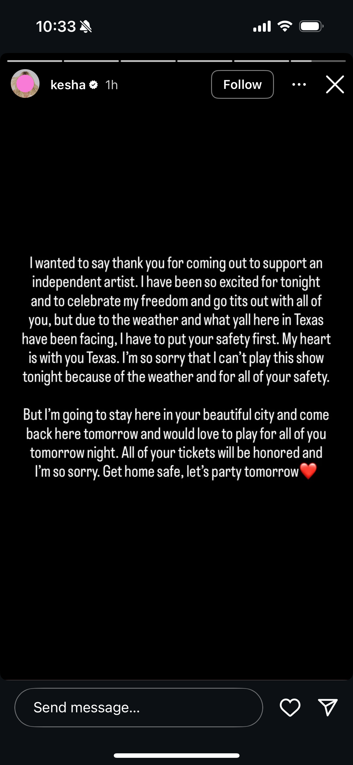 “I wanted to say thank you for coming out to support an independent artist. I have been so excited for tonight and to celebrate my freedom and go tits out with all of you, but due to the weather and what yall here in Texas have been facing, I have to put your safety first. My heart is with you, Texas. I’m so sorry that I can’t play this show tonight because of the weather and for all of your safety,” she wrote, hoping we can all party tonight if the weather holds up.