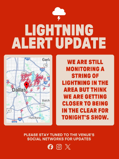 At 8:15 p.m., they posted an update, writing, “We are still monitoring a string of lightning in the area but we think we are getting closer to being in the clear for tonight’s show.”